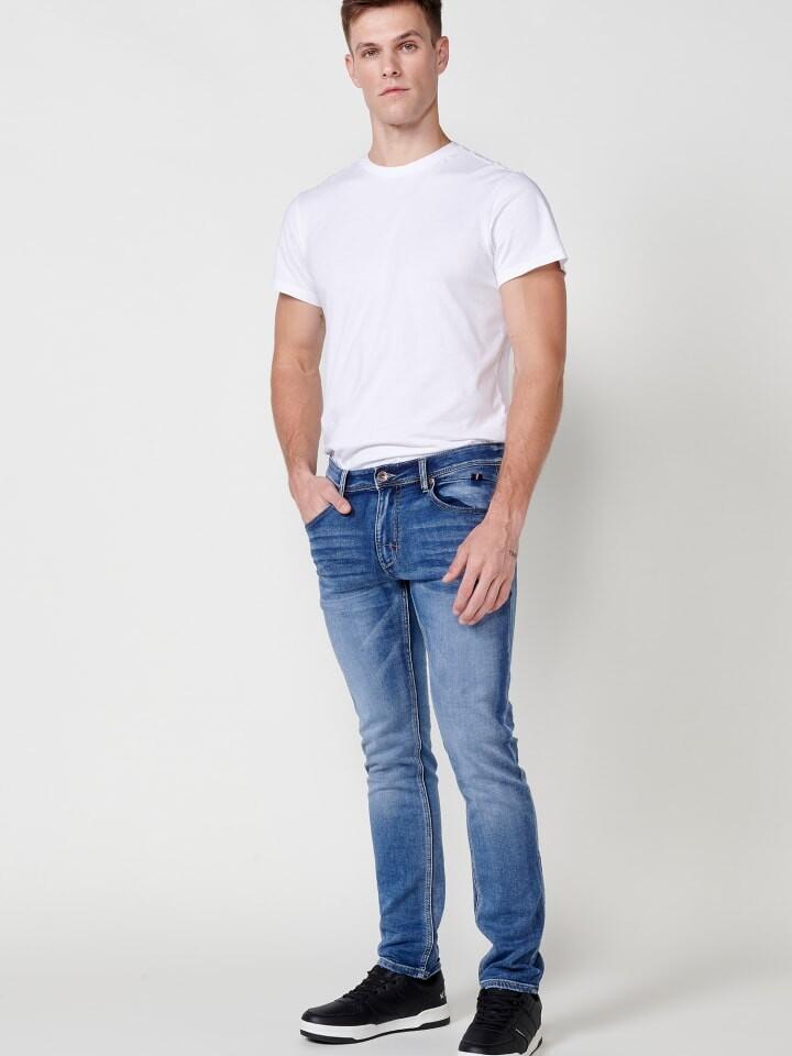 Длинные брюки узкого кроя. Пять карманов, один карман для монет. Состав: 75% хлопок, 23% полиэстер, 2% эластан.