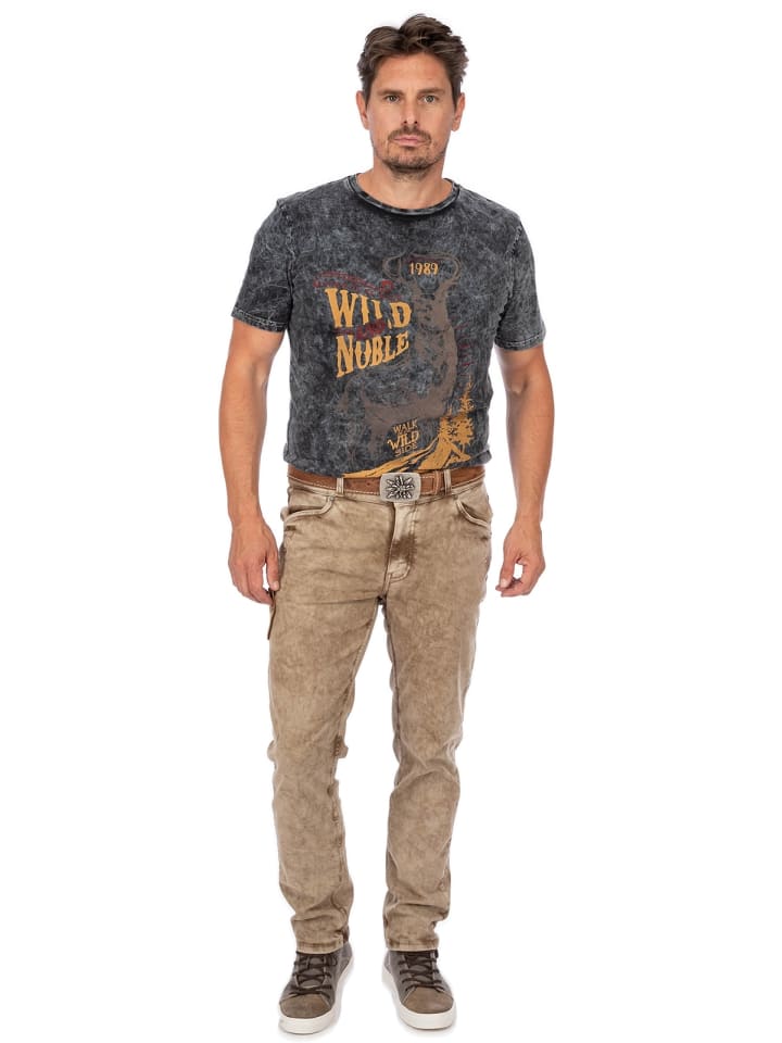 Веселитесь с ГЕКТОРОМ. Короткие традиционные джинсы HECTOR в армейском цвете впечатляют своей великолепной посадкой! Брюки длиной до колена имеют широкий пояс, который застегивается на две традиционные серебряные пуговицы. Также возможно сочетание широкого традиционного ремня со стильной футболкой. Визуальные акценты создают контрастные светло-коричневые швы по бокам и небольшой боковой карман. Изогнутая вышивка также привлекает внимание: она отсылает к ледерхозенам в традиционном стиле.