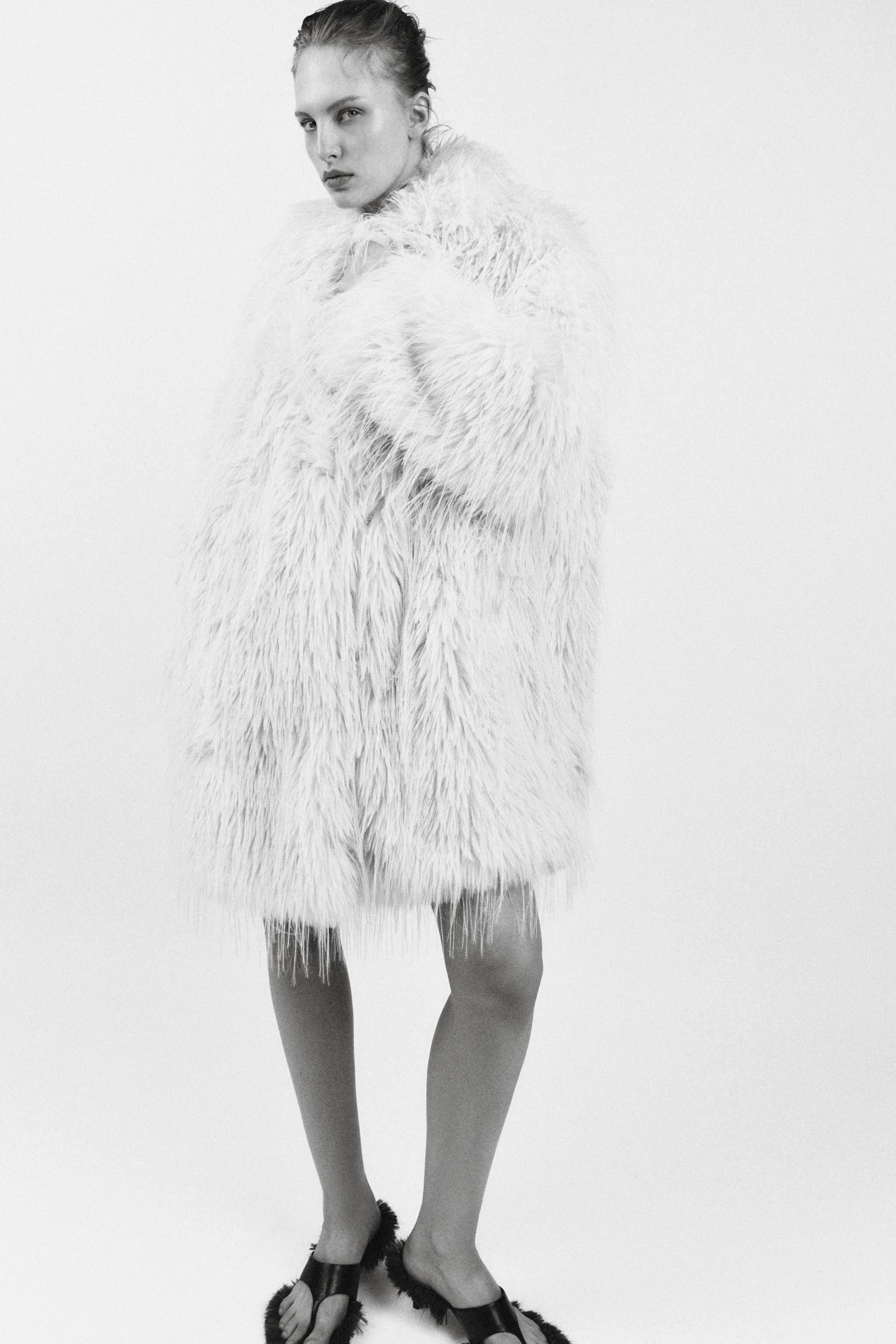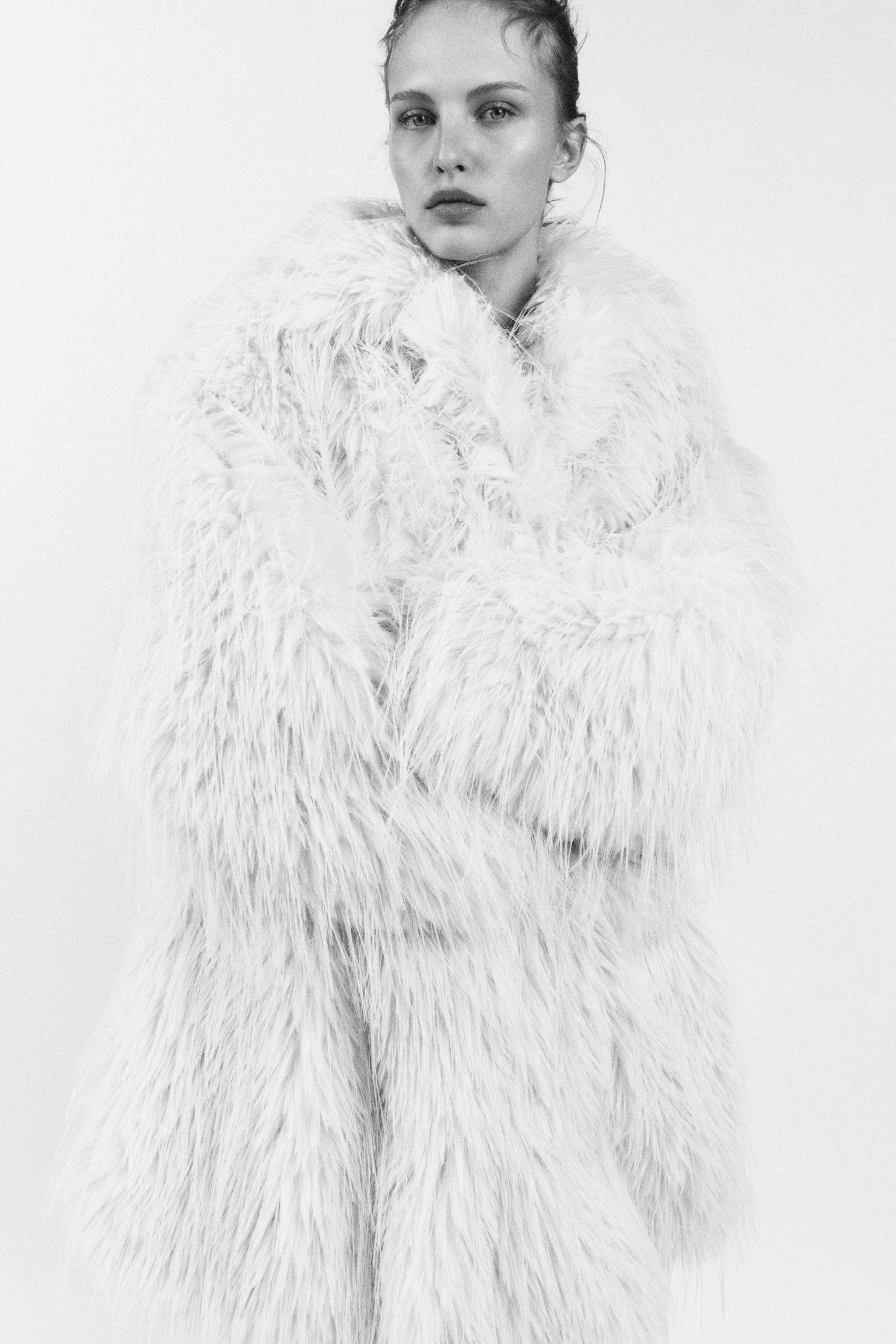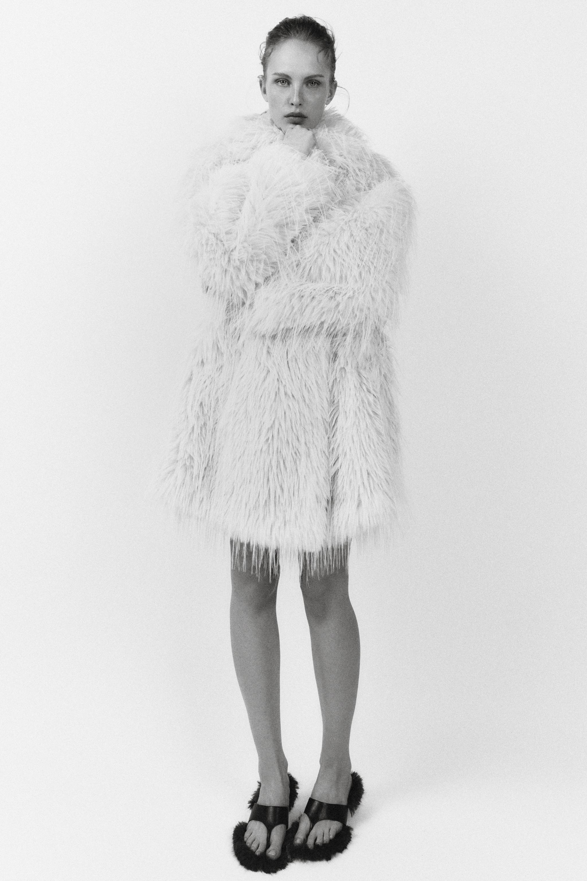 Пальто с длинными рукавами и воротником с лацканами. Передние карманы, аппликации из искусственного меха, подкладка и потайная застежка на пуговицы спереди.