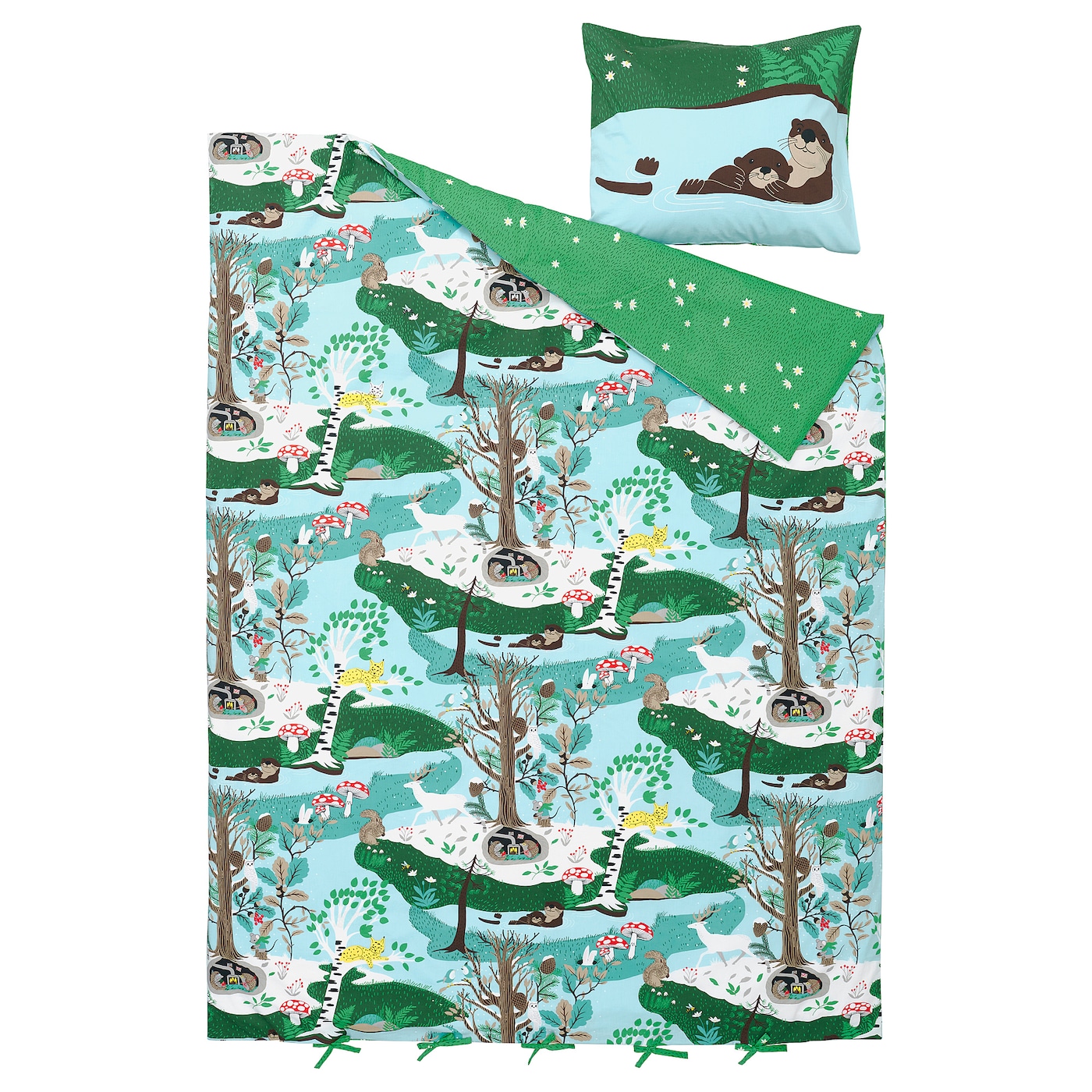 Жизнь протекает по обе стороны мягкого хлопково-вискозного пододеяльника - за плещущейся в воде выдрой с детенышем наблюдает рысь, а ежи греются у костра в зимнем гнезде, построенном у подножия дерева.