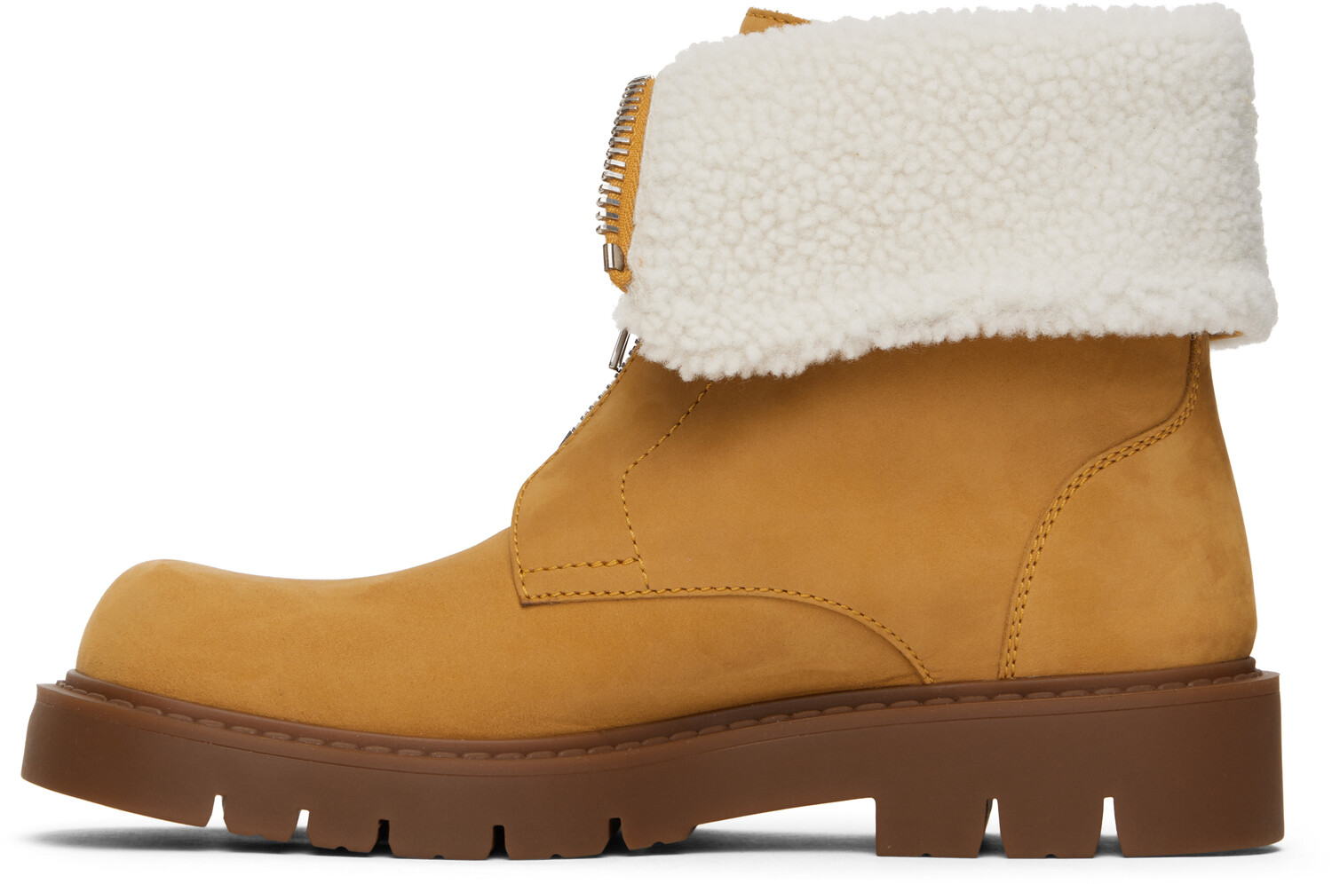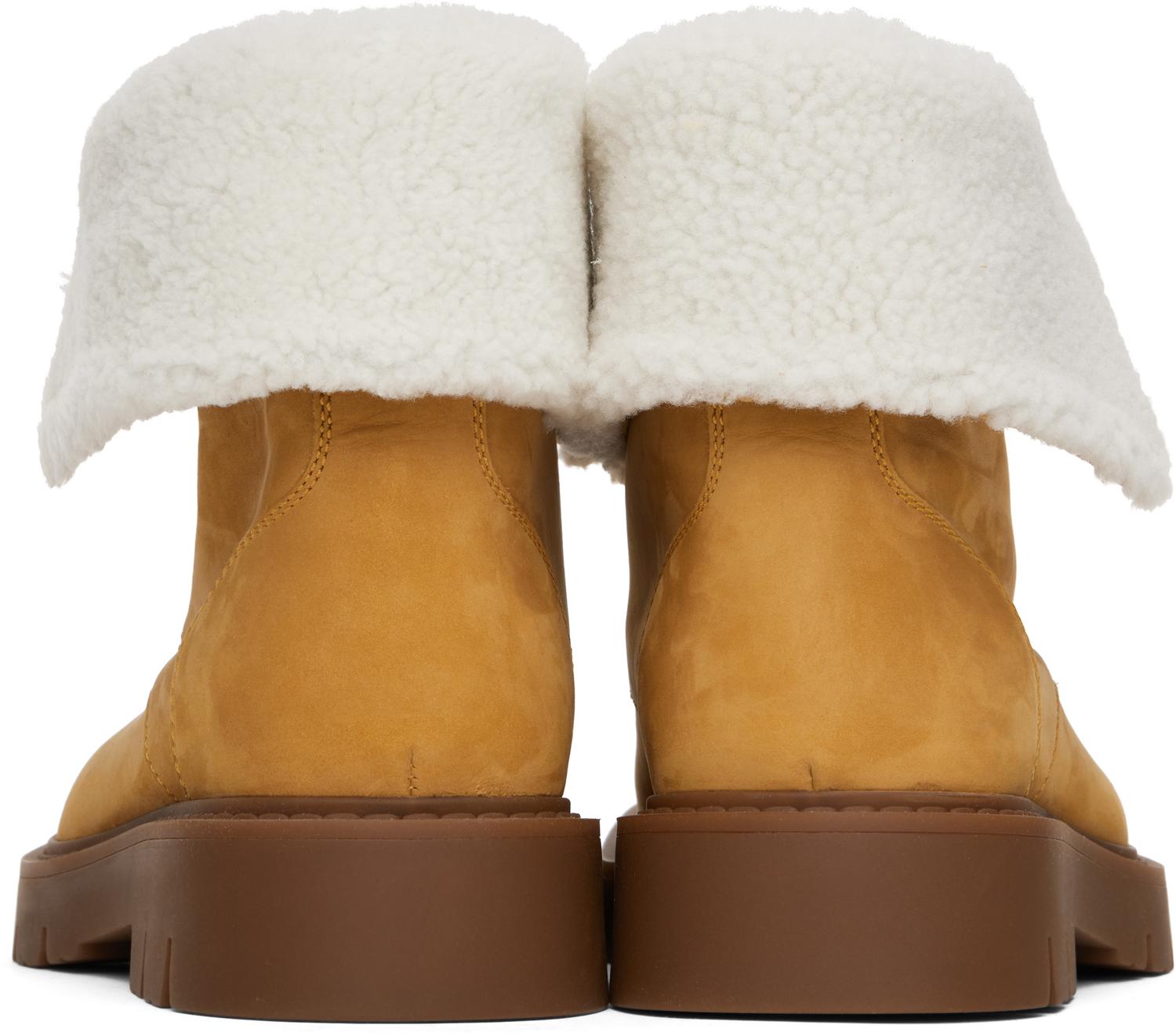 Ботильоны бежевого цвета Haddock. Ботинки из нубука бежевого цвета до щиколотки. · Квадратный носок. · Застежка-молния на союзке. · Тисненый логотип на язычке. · Подкладка из овчины. · Отстрочка по ранту. · Резиновая подошва с выступами. · Каблук: H1,5". Цвет поставщика: охра/попкорн. Верх: телячья кожа. Подошва: резина. Сделано в Италии.