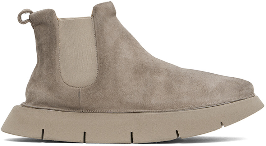 Бежевые ботинки Beatle Intagliata. Замшевые ботинки бежевого цвета до щиколотки. · Потертости по всей поверхности. · Мягкий воротник. · Петля для подтягивания на воротнике пятки. · Эластичные вставки по бокам. · Подкладка из зернистой кожи. · Прорезиненная подошва с протектором. · Платформа: H1.5". Цвет поставщика: Clay. Верх: кожа. Подошва: резина. Сделано в Италии.