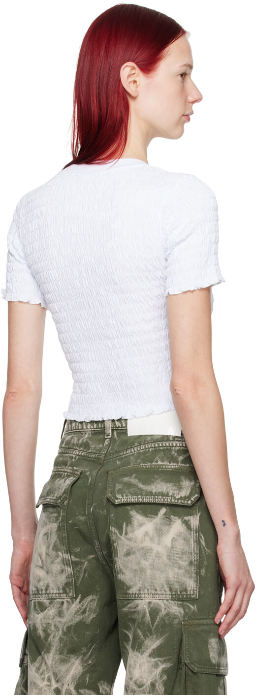 Белая футболка со сборками. Футболка из хлопкового джерси. Сборки по всей длине.· Круглый вырез горловины в рубчик.· Логотип, напечатанный спереди.· Фестончатый край по подолу и манжетам. Цвет поставщика: оптический белый 100% хлопок. Сделано в Италии.