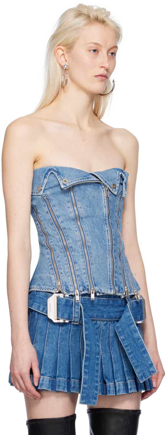 Синий корсет из байкерского денима. Корсет из неэластичного денима. Потертости и застежки-молнии по всему изделию. · Открытое плечо. · Застежка на кнопки на отложном вырезе в форме сердечка. · Полностью хлопковая подкладка полотняного переплетения. Цвет поставщика: американский синий, 100% хлопок. Сделано в Турции.