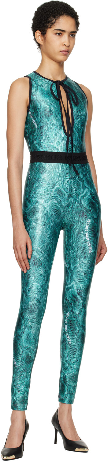 Синее боди с принтом. Боди из эластичного полиэстерового трикотажа. Логотипы и рисунок под змеиную кожу напечатаны по всему изделию. · Завязывается на завязках на глубоком V-образном вырезе. · Эластичная отделка на воротнике и проймах. · Регулируемая застежка на кнопках внизу. Цвет поставщика: аквамарин 80% полиэстер, 20% эластан. Сделано в Италии.
