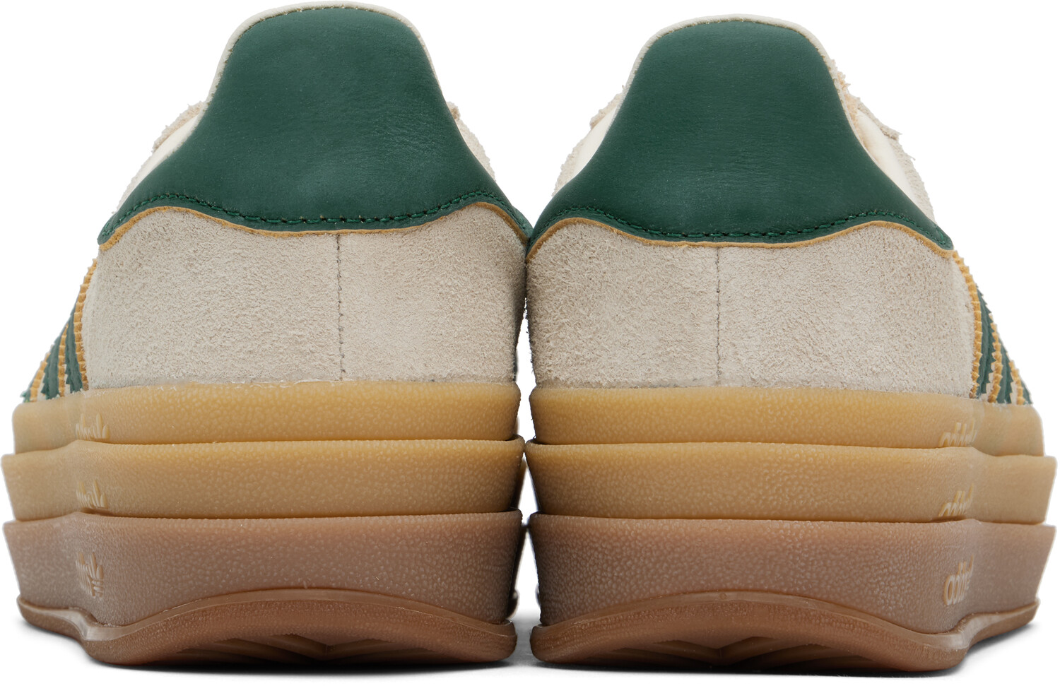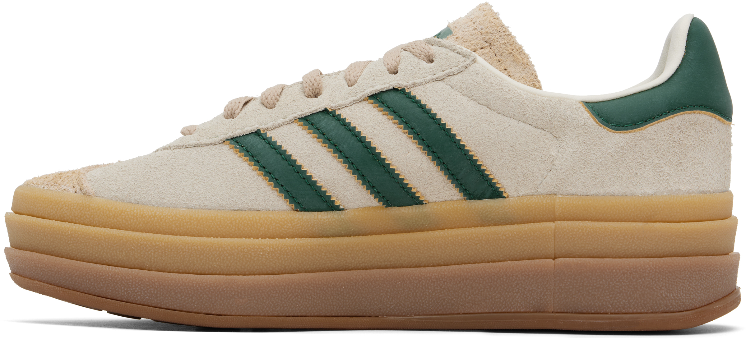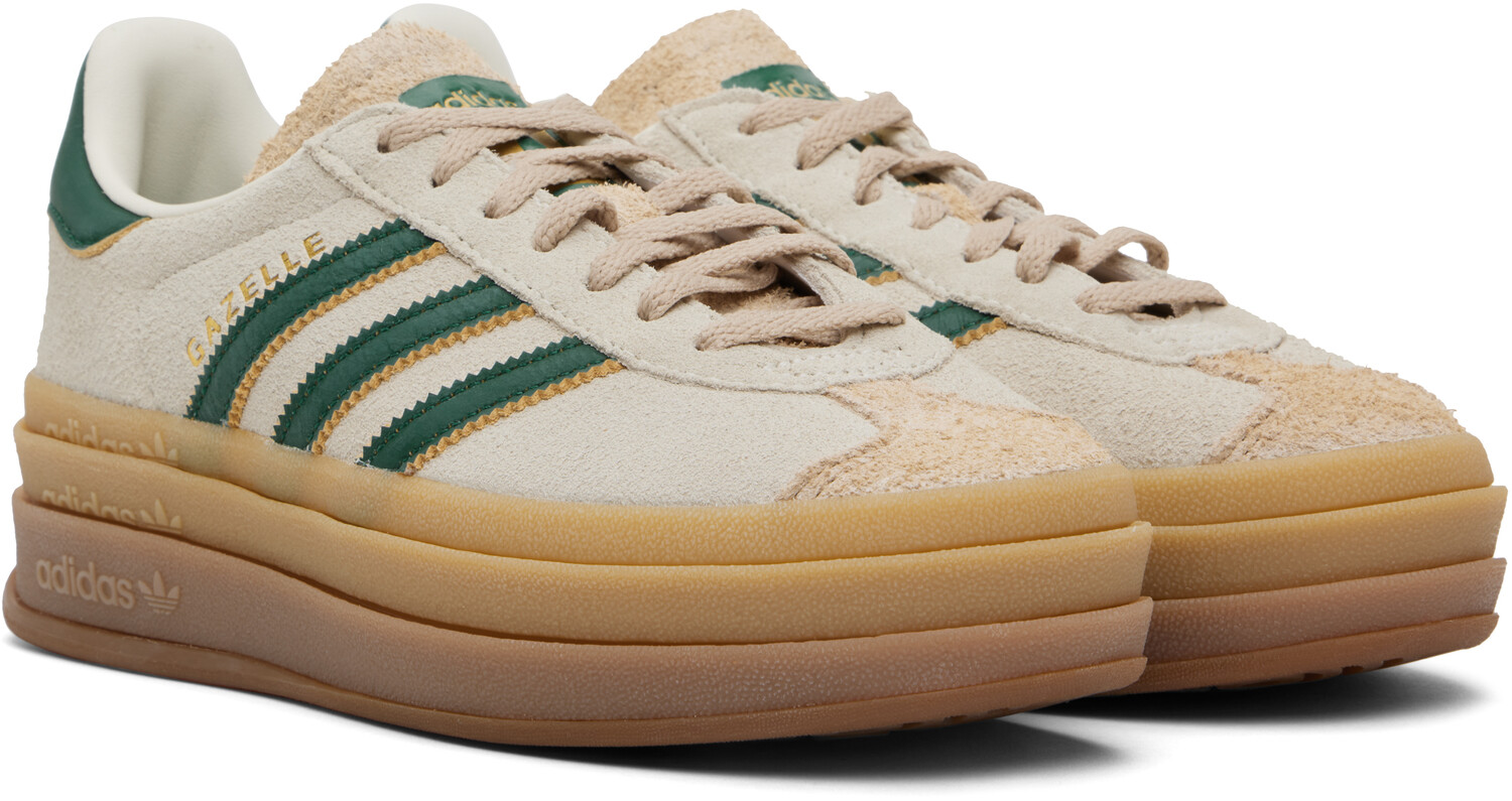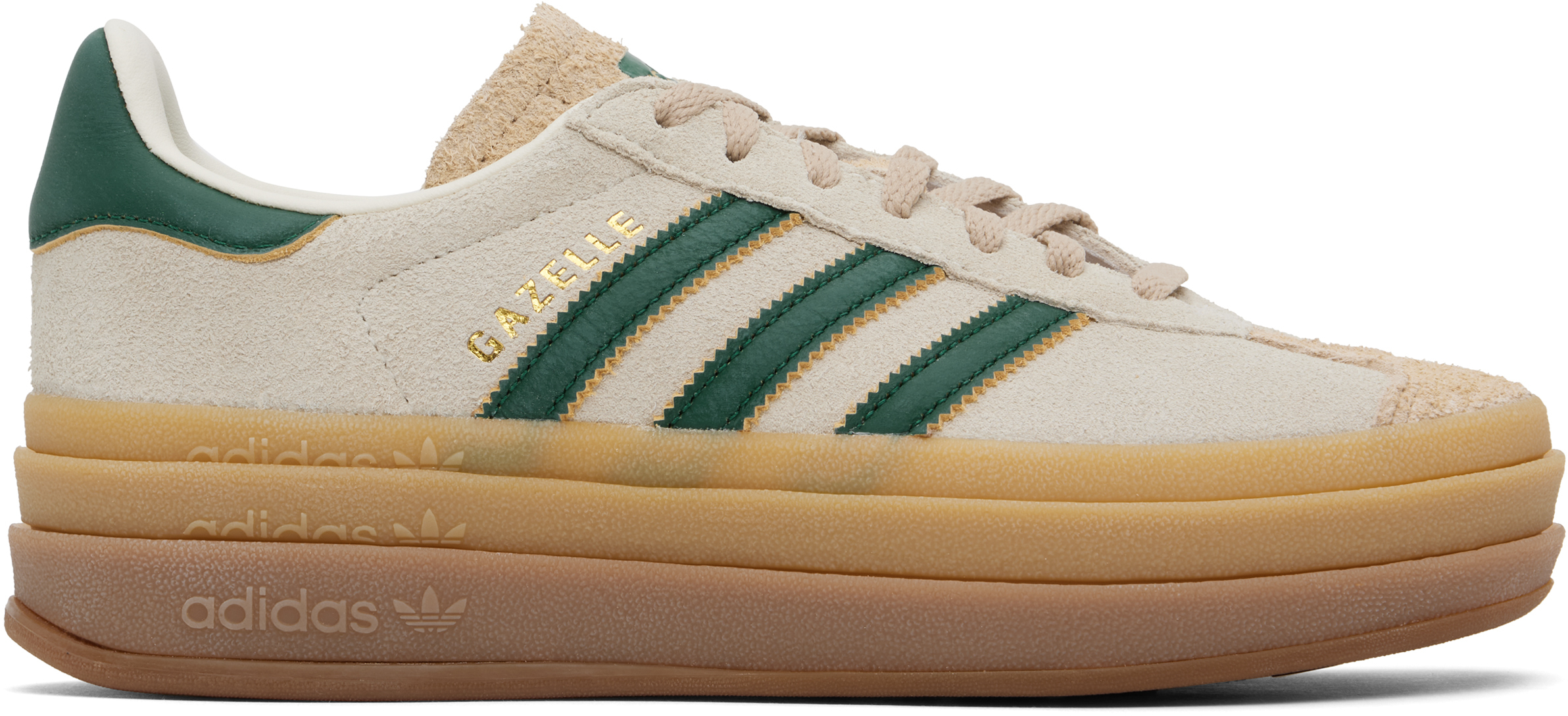 Кроссовки Beige Gazelle Bold. Низкие замшевые кроссовки бежевого и зеленого цвета.· Отделка из полированной искусственной кожи по всей длине· Шнуровка· Логотип, тисненый на текстурированном язычке· Мягкий воротник· Текст, приклеенный с внешней стороны· Фирменные зубчатые полосы по бокам· Подкладка из полированной искусственной кожи и трикотажа· Логотип, тисненый на многоуровневом ранте· Резиновая подошва с протектором· Платформа: H2" Цвет поставщика: Кремово-белый/Студенческий зеленый/Волшебный бежевый Верх: кожа, синтетика. Подошва: резина. Сделано во Вьетнаме.