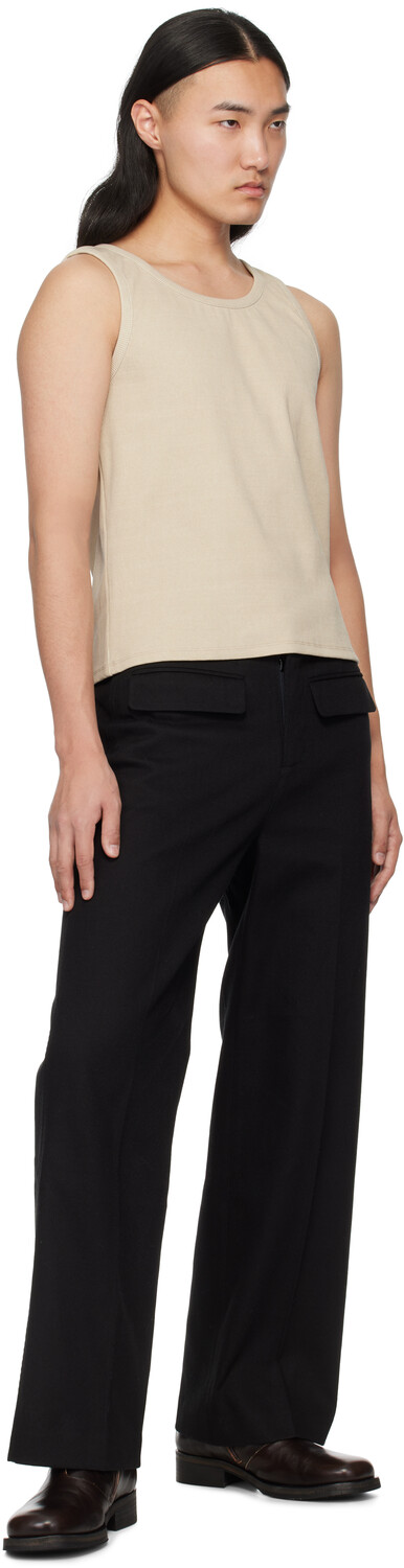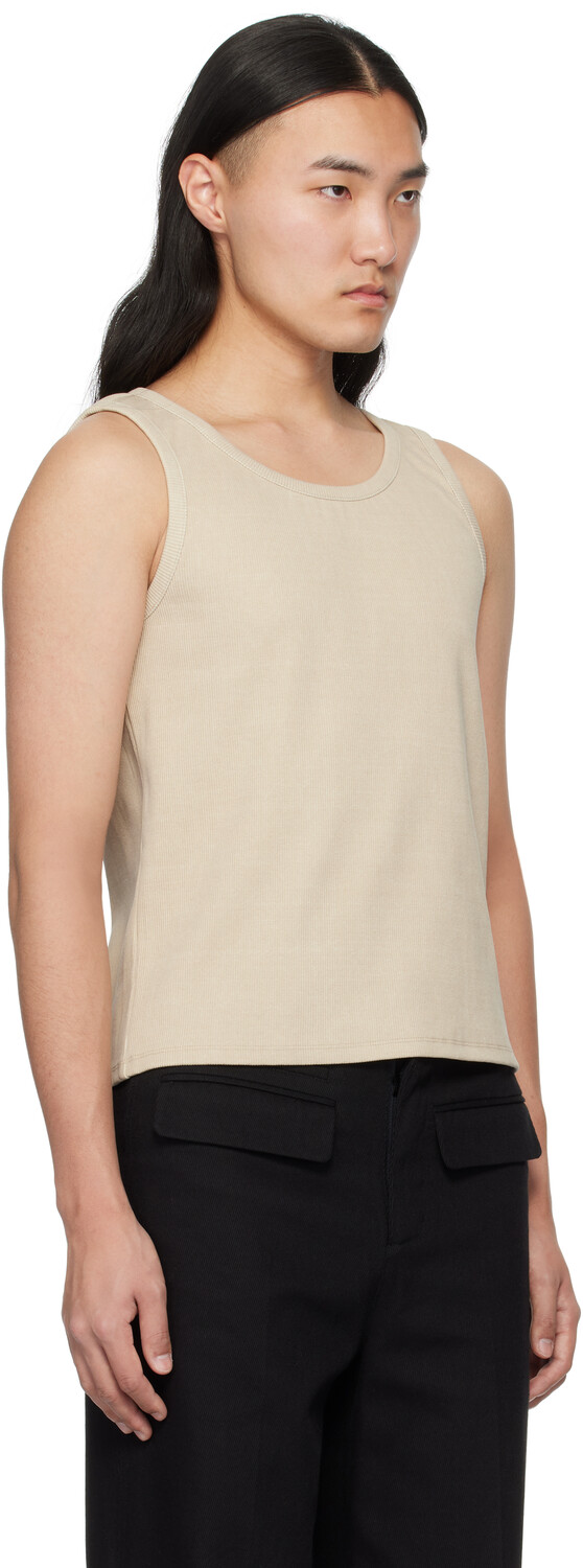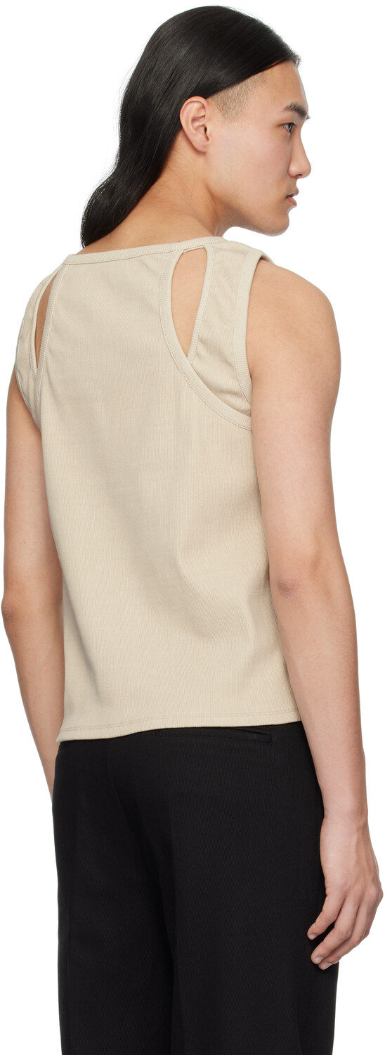 Бежевая майка с вырезами. Майка из эластичного хлопкового трикотажа в рубчик. · Логотип на подоле. · Вырезы сзади. Цвет поставщика: Коричневый меланж 95% хлопок, 5% полиуретан. Сделано в Южной Корее.