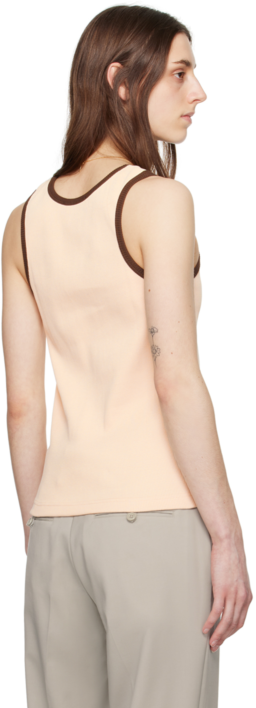 Бежевая вышитая майка. Топ из органического хлопка в рубчик. · Овальный вырез. · Вышитый логотип на груди. Цвет поставщика: верблюжий с коричневым 100% органический хлопок. Сделано в Португалии.