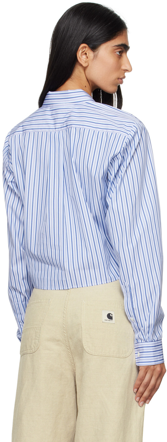 Синяя укороченная рубашка. Рубашка из хлопкового поплина Deadstock. Полоски по всему изделию.· Отложной воротник· Застежка на пуговицы· Вышитый логотип на груди· Укороченный подол· Манжеты-бочонки на одной пуговице· Складка на кокетке сзадиЦвет поставщика: Синяя полоска 100% хлопок. Сделано во Франции.