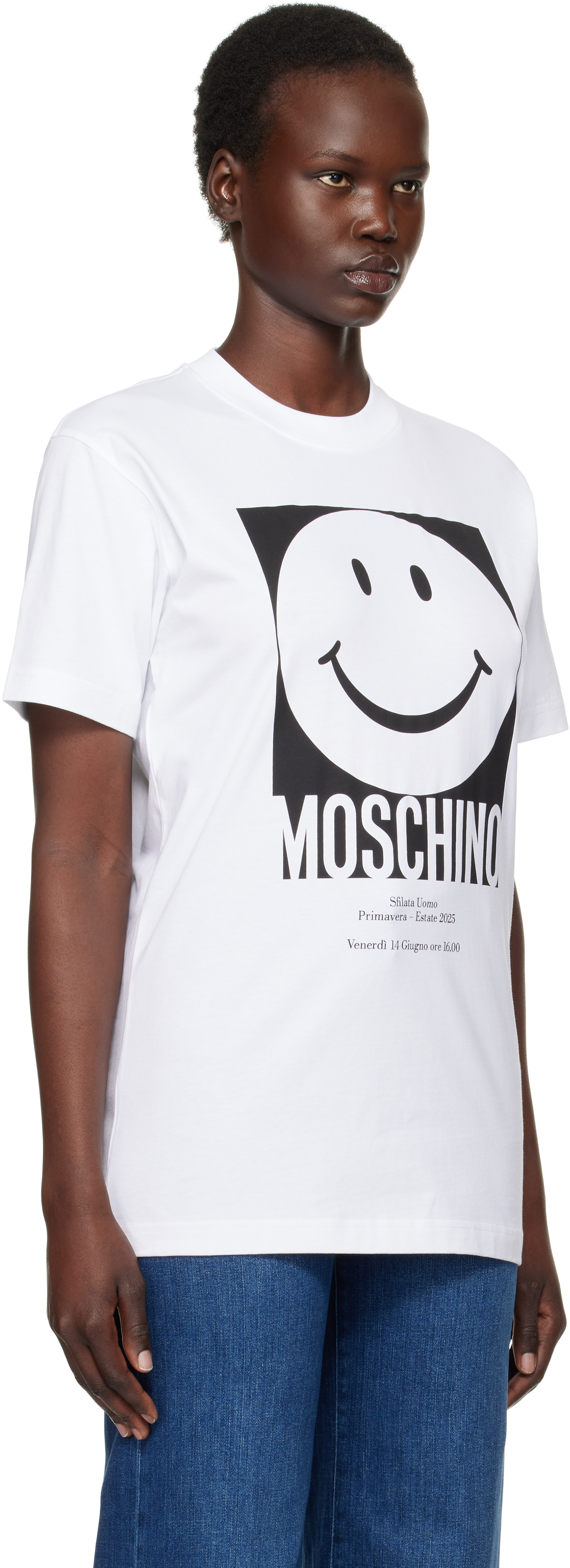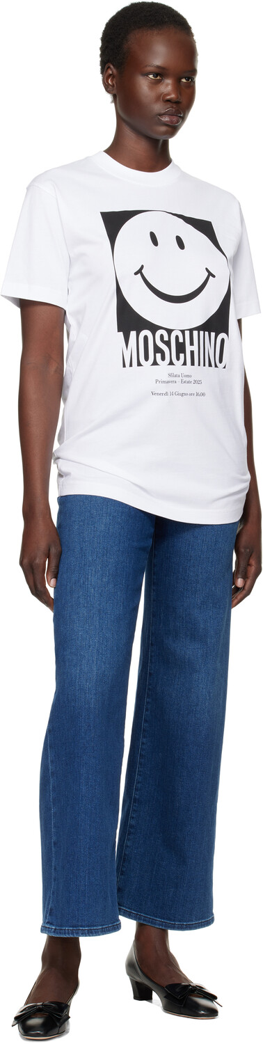 Белая футболка со смайликами. Футболка из органического хлопкового джерси. · Круглый вырез горловины в рубчик. · Логотип и текст, напечатанные спереди. · Спущенные плечи. Часть коллекции Moschino Smiley. Цвет поставщика: многоцветный белый, 100% хлопок. Сделано в Португалии.