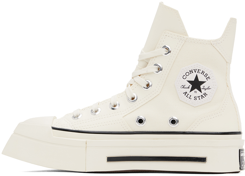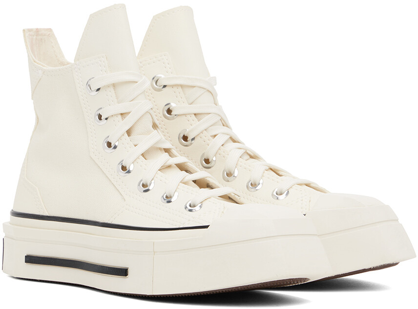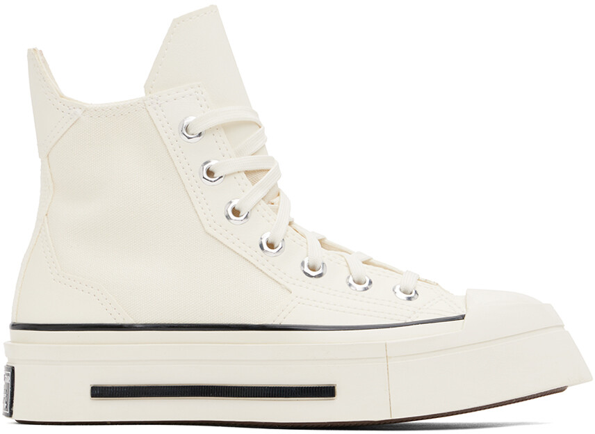 Кроссовки Chuck 70 De Luxe Squared High Top цвета Off-White. Кроссовки из холщовой ткани и зернистой искусственной кожи цвета Off-White. Квадратный резиновый носок. Шнуровка. Логотип на внутренней стороне. Люверсы для вентиляции на внутренней стороне. Язычок для подтягивания на воротнике пятки. Мягкая стелька Ortholite. Прорезиненная нашивка с логотипом на межподошве. Резиновая подошва с протектором. Цвет поставщика: Egret/Black/Egret. Верх: текстиль, синтетика. Подошва: резина. Сделано во Вьетнаме.