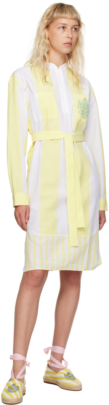Бело-желтое платье Hotel Olympia Edition Poolside. Платье из хлопчатобумажной ткани сирсакер. Полоски по всему изделию. · Воротник-стойка · Планка с тремя пуговицами · Накладные карманы · Логотип напечатан на груди · Съемный пояс на талии · Низ рубашки · Манжеты-бочонки с одной пуговицей · Складка на кокетке сзадиЧасть коллекции Sweet Souvenirs в рамках сотрудничества Maison Kitsune x Hotel Olympia.Цвет поставщика: лимонный 100% хлопок. Сделано в Португалии.