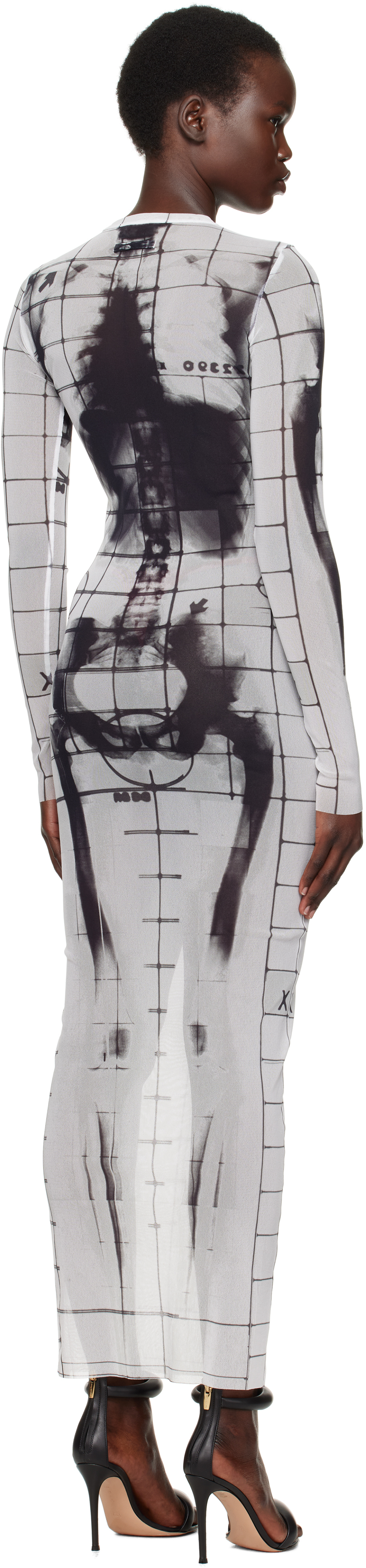 Бело-черное платье макси «The Squeletor». Полупрозрачное платье макси из нейлонового тюля. Графический и клетчатый рисунок напечатан по всему изделию. Круглый вырез. Необработанный край на подоле и манжетах. Петля на воротнике сзади. Цвет поставщика: белый/черный 100% нейлон. Сделано в Италии.