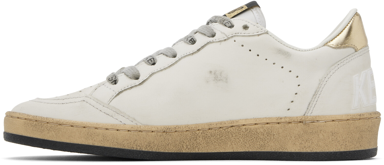 Кроссовки Ball Star White & Gold. Низкие кроссовки из полированной кожи ручной работы в белых и золотых тонах. · Пятна и перфорированные детали по всей модели· Шнуровка· Нашивка с логотипом на мягком язычке· Мягкий воротник· Аппликация в виде звезды на внешней стороне· Золотистый логотип· Тисненый текст на заднике· Подкладка из махровой ткани и полированной кожи· Текстурированная резиновая межподошва· Рельефная резиновая подошваЦвет поставщика: молочный/золотой Верх: кожа. Подошва: резина. Сделано в Италии.