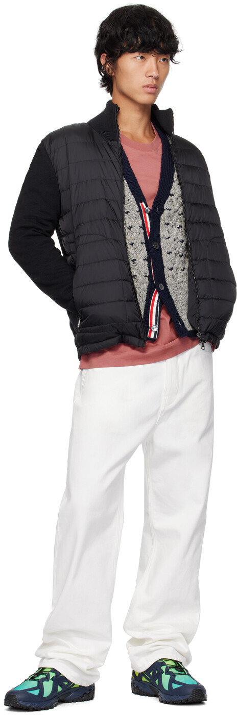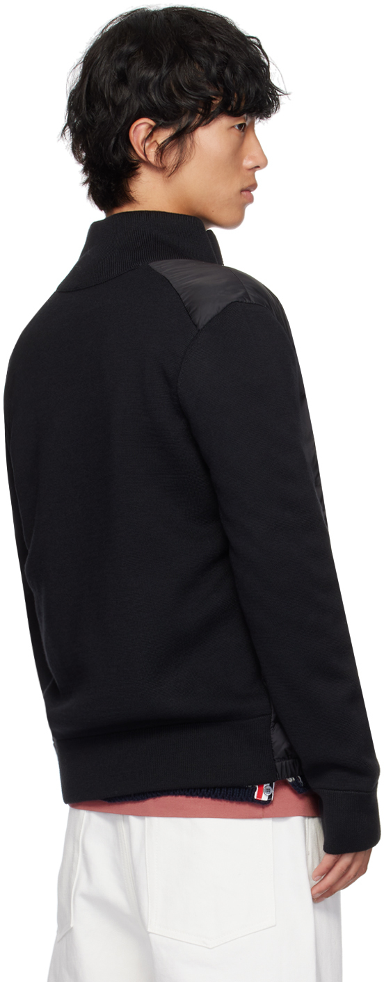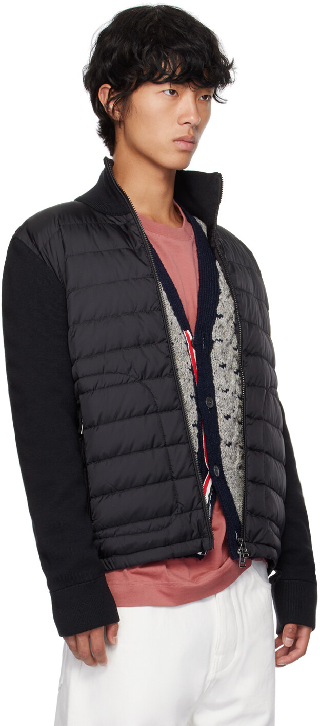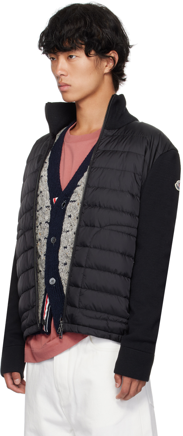 Черный стеганый пуховый кардиган. Стеганый кардиган из нейлоновой тафты и трикотажа с добавлением натуральной шерсти, сертифицированный DIST.· Панельная конструкция· Воротник-стойка· Двусторонняя застежка-молния· Карманы на молнии· Частично эластичный подол· Войлочная нашивка с логотипом на рукаве· Частичная подкладка из тафтыЦвет поставщика: черныйНаполнитель: 90% гусиный пух, 10% перо. Корпус 1: 100% полиамид. Корпус 2: 50% натуральная шерсть, 50% акрил. Подкладка: 100% полиамид. Сделано в Молдове.