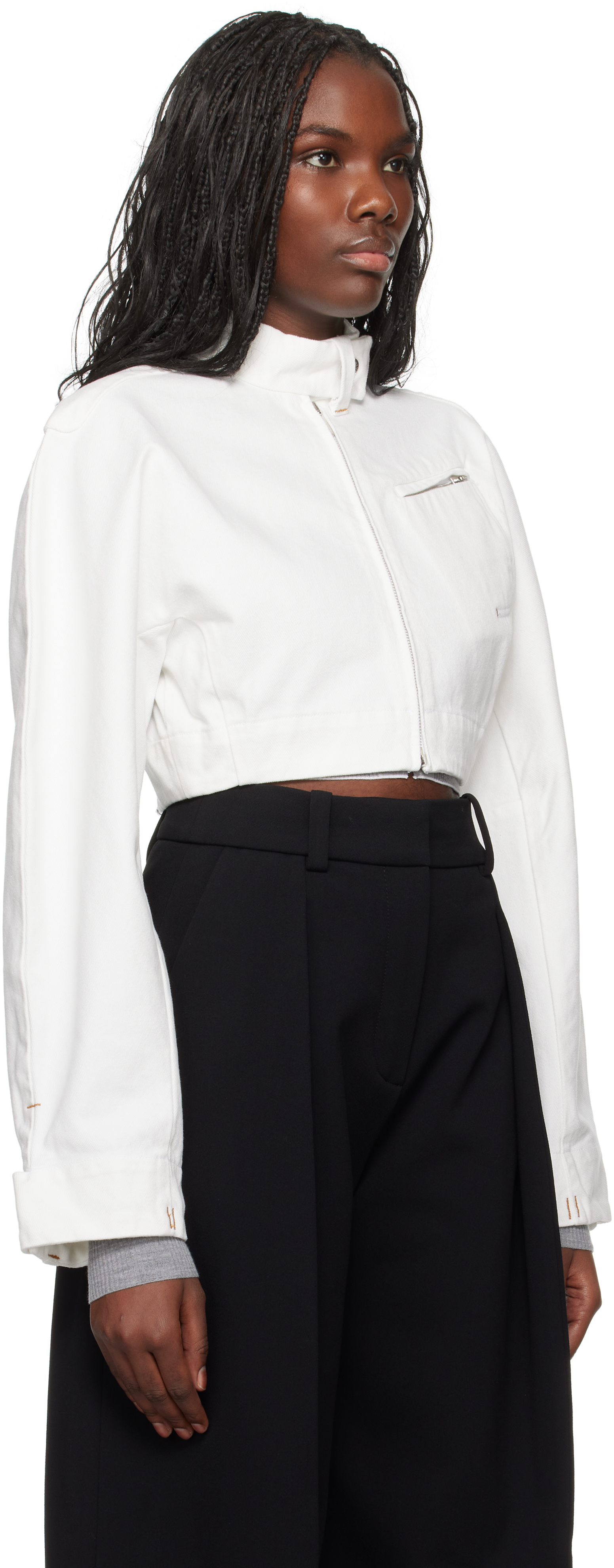 Белая джинсовая куртка La Casa 'La veste de-Nîmes Cabrio'. Неэластичная джинсовая куртка. · Шлевка для ремня и застежка на кнопку на воротнике-стойке. · Застежка-молния. · Карман на молнии на груди. · Укороченный подол. · Рукава с кокеткой. · Шлевка для ремня и застежка на кнопку на манжетах. · Разрез на молнии на манжетах. · Петля для застежки на воротнике сзади. · Выгравированный логотип серебристого тона. · Контрастная строчка бежевого цвета. Часть коллекции La Casa. Цвет поставщика: Off-white 100% хлопок. Сделано в Италии.