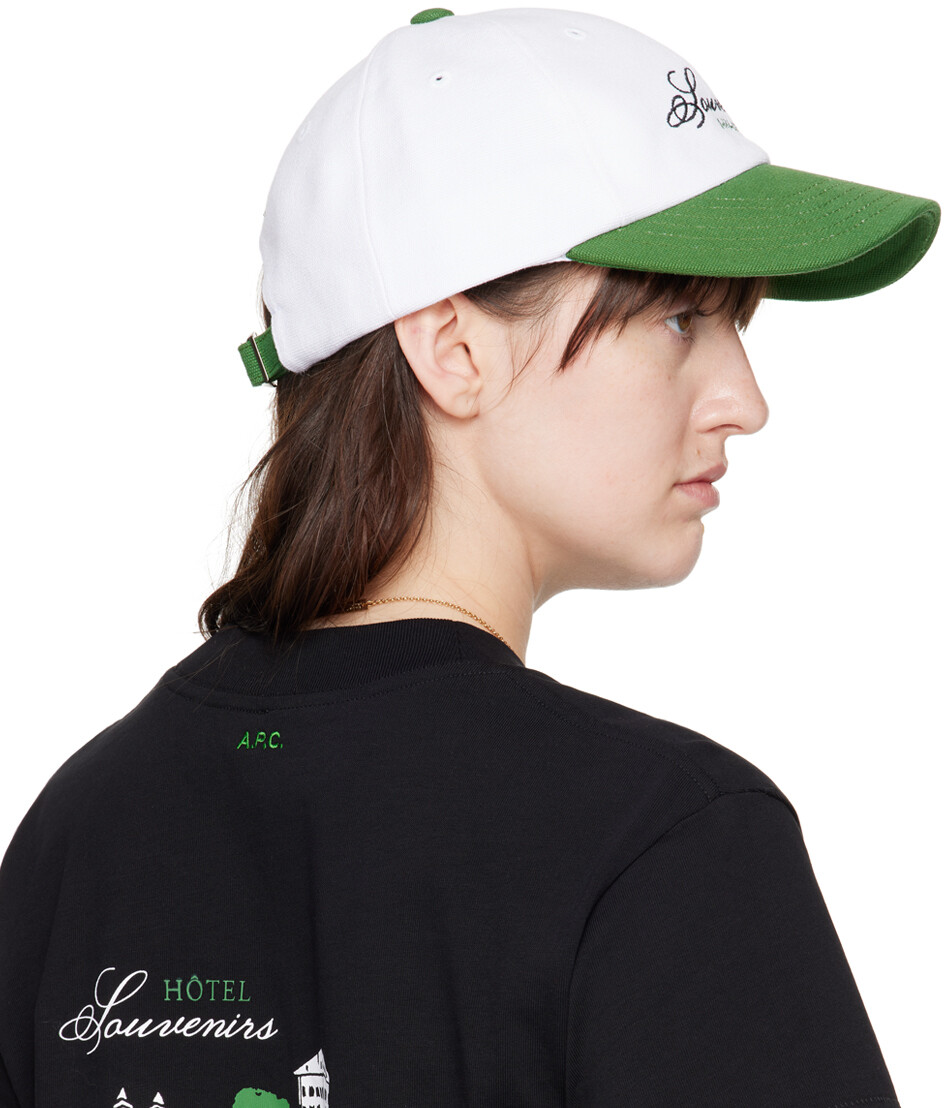 Белая кепка JJJJound Edition 'Hôtel Souvenirs'. Кепка из хлопчатобумажной ткани с панелями белого и зеленого цвета.· Вышитые люверсы на тулье· Вышитый текст на лицевой стороне· Изогнутый козырек· Логотип-флажок на задней стороне· Ремешок на затылке· Налобник из твила· Частичная подкладка из хлопчатобумажной ткани с добавлением твила. Часть сотрудничества APC x JJJJound. Цвет поставщика: белый. Основная часть: 100% хлопок. Подкладка: 60% хлопок, 40% полиэстер. Сделано в Болгарии.
