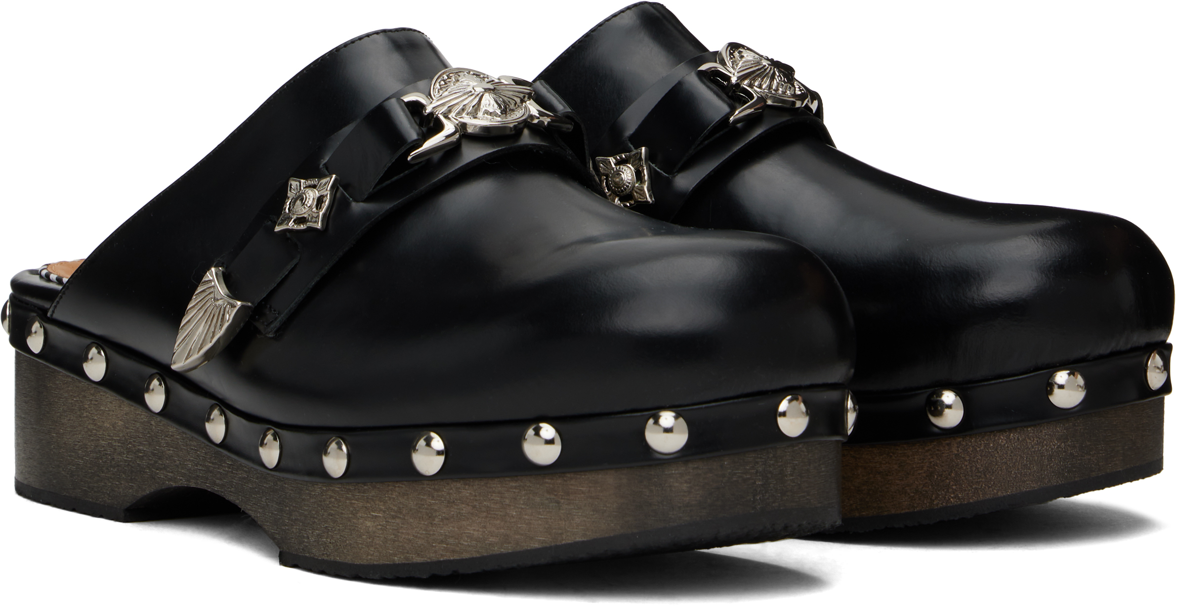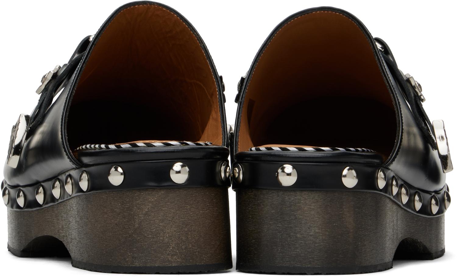 Черные мокасины Stud. Полированные кожаные мокасины черного цвета.· Ремешок с фирменной графической фурнитурой на мыске.· Логотип на мягкой кожаной стельке.· Шипы на ранте.· Деревянная платформа на средней подошве.· Подошва из каучука.· Платформа: H1.25"· Каблук: H2" Цвет поставщика: черный Верх: кожа. Подошва: дерево, резина. Сделано в Португалии.