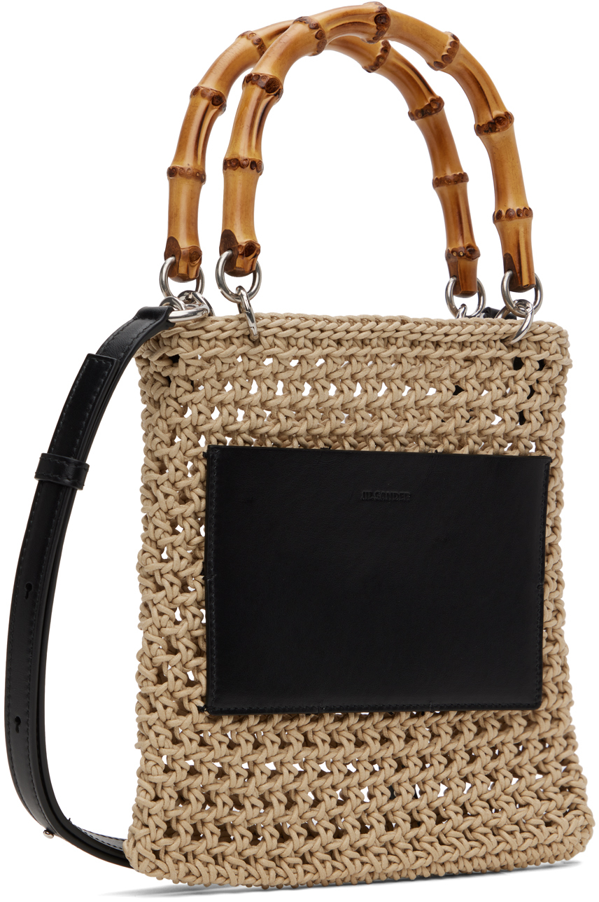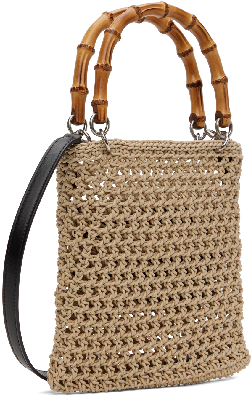 Сумка бежевого цвета из бамбука. Сумка через плечо из хлопка, связанная крючком, бежевого цвета.· Отделка из полированной телячьей кожи по всей поверхности.· Эмалированные бамбуковые ручки для переноски.· Регулируемый ремень через плечо.· Накладной карман с тиснением логотипа на лицевой стороне.· Открытый воротник.· Без подкладки.· В8,5" x Ш8,5" x Г0,75". Цвет поставщика: бежевый. Основная часть: 100% хлопок. Отделка: 100% телячья кожа. Сделано в Италии.
