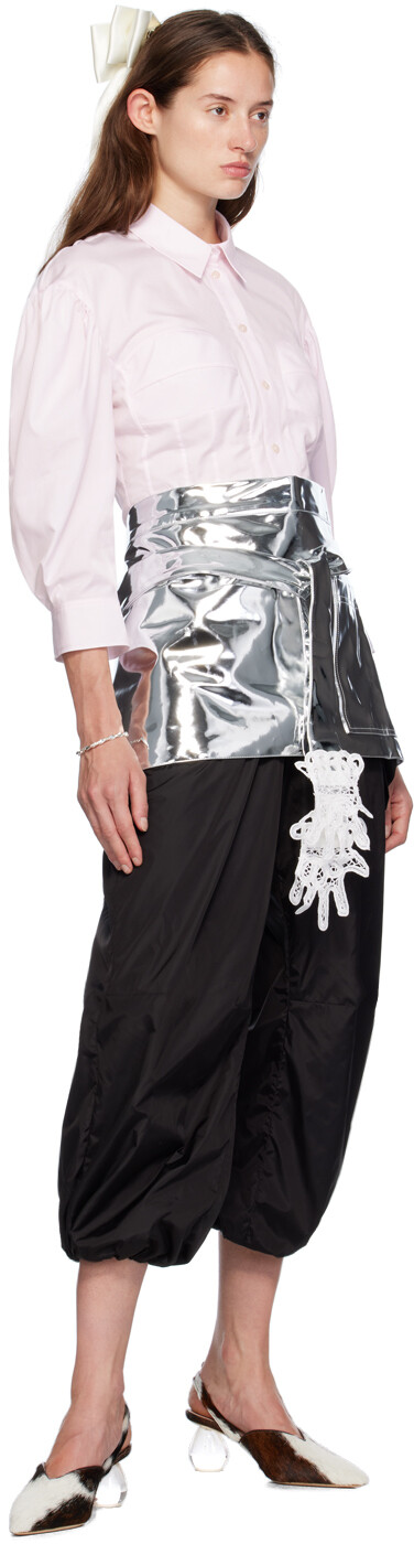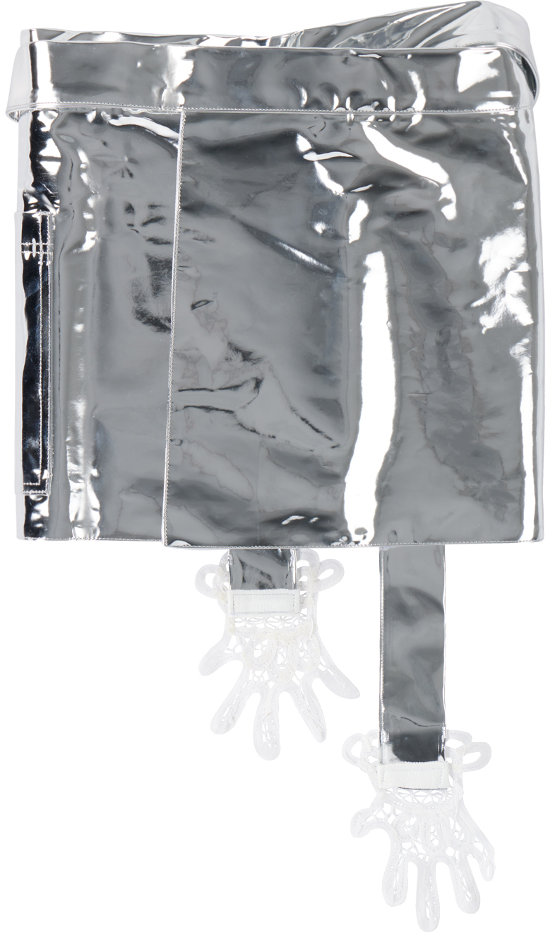 Серебряный мини-фартук с кружевом на руках. Виниловый фартук серебристого тона. · Аппликации из кружева ручной работы на завязывающемся поясе. · Накладной карман на лице. · Подкладка из хлопкового поплина. · В13,75" x Ш32,75". Цвет поставщика: серебристый. Корпус: 100% поливинилсилоксан. Подкладка: 100% хлопок. Сделано в Египте.