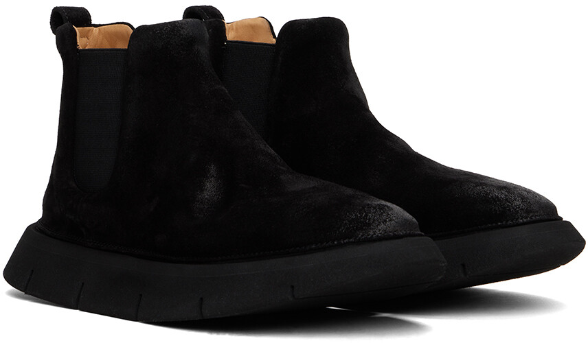 Черные ботинки Beatle с интальятой. Замшевые ботинки черного цвета до щиколотки. Потертости по всей поверхности. Мягкий воротник. Петля для подтягивания на воротнике пятки. Эластичные вставки по бокам. Подкладка из зернистой кожи. Подошва из рифленой вспененной резины. Платформа: H1.5". Цвет поставщика: черный. Верх: кожа. Подошва: резина. Сделано в Италии.