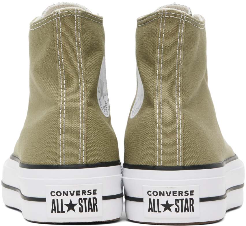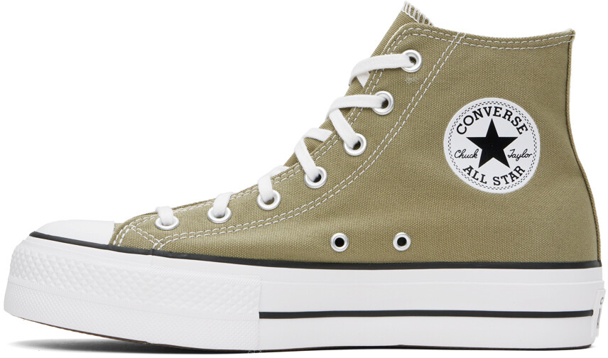 Кроссовки Chuck Taylor All Star Lift Platform цвета хаки. Высокие парусиновые кроссовки цвета хаки. Резиновый носок. Шнуровка. Нашивка с логотипом и люверсы с внутренней стороны. Мягкая стелька из ЭВА. Прорезиненная нашивка с логотипом на пятке. Подошва из резины с протектором. Контрастная строчка белого цвета. Платформа: H1.5". Цвет поставщика: Mossy sloth/белый/черный. Верх: текстиль. Подошва: резина. Сделано во Вьетнаме.