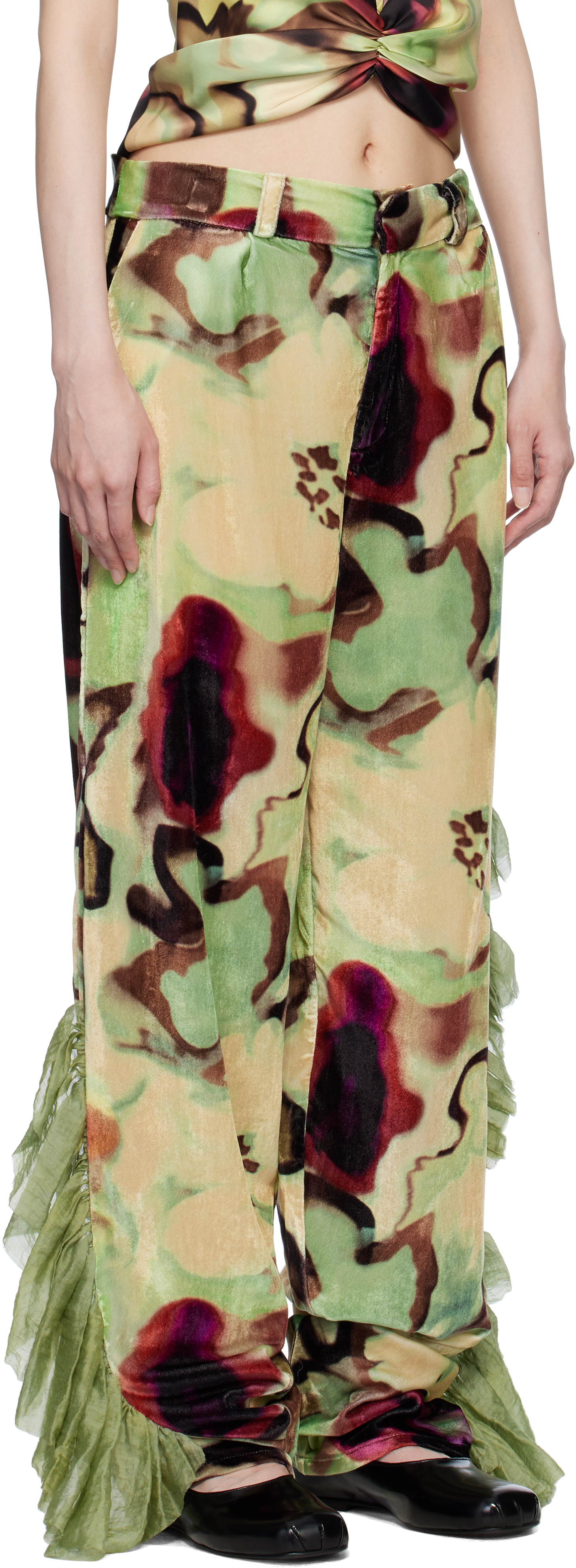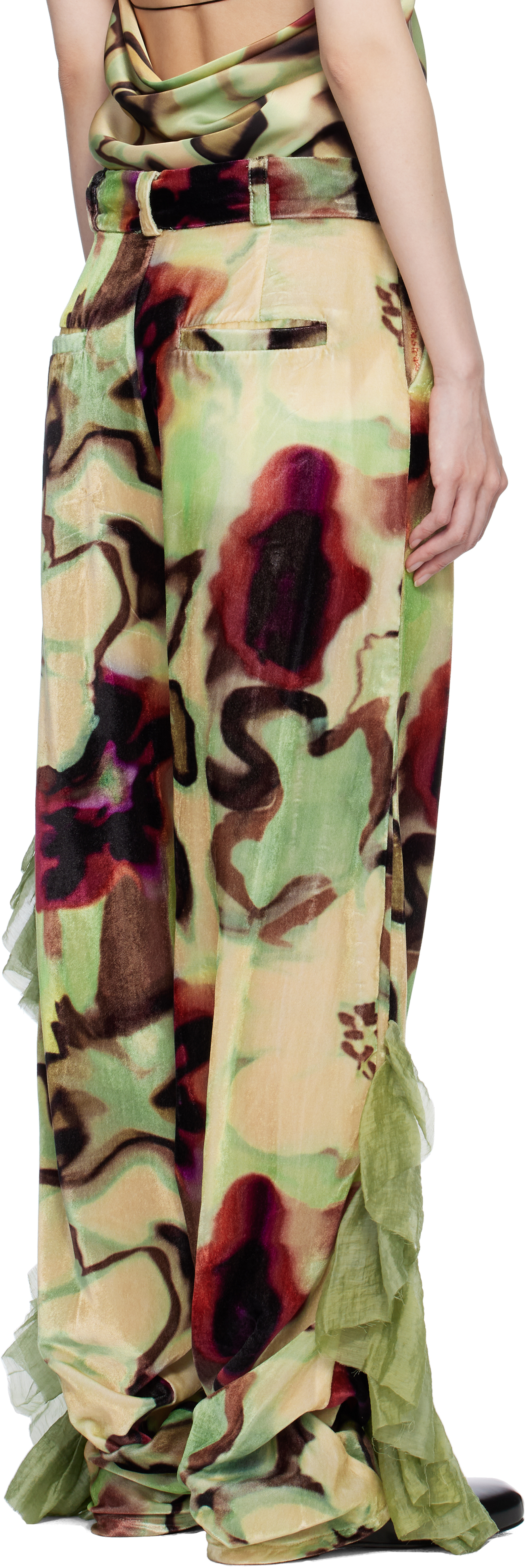 Брюки Dante бежево-зеленого цвета с оборками. Свободные брюки из нейлоново-бархатного смесового материала. Графический рисунок напечатан по всей длине.· Средняя посадка· Шлевки для ремня· Модель с четырьмя карманами· Застежка-молния· Отделка из жатой вуали с оборками по внешним швамЦвет поставщика: акварельный цветочный Состав: 80% нейлон, 20% вискоза. Отделка: 70% тенсел, 30% нейлон. Сделано в США.