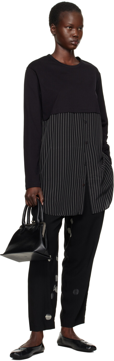 Черные брюки U-High Waist. Брюки из саржи с добавлением вискозы и купро. Узор в виде точек по всей длине. · Высокая посадка. · Шлевки для ремня. · Завязывающийся шнурок на поясе. · Модель с четырьмя карманами. · Застежка-молния. Цвет поставщика: черный. 67% вискозы, 33% купро. Сделано в Японии.