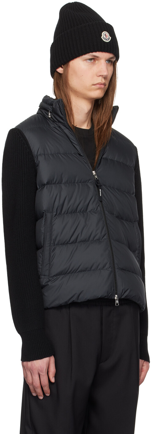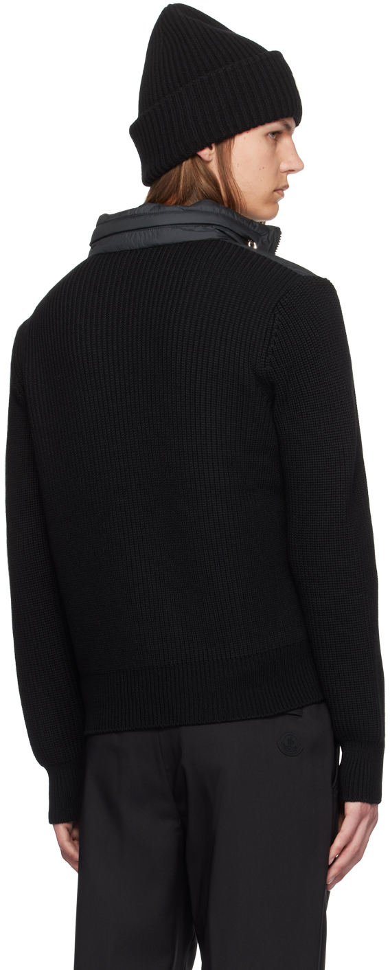 Черная толстовка с капюшоном на молнии. Наполнитель из полиэстеровой тафты. Рукава и спинка из натуральной шерсти, трикотажная вязка 5 калибра. Панельная конструкция. Откидной капюшон на воротнике-стойке. Двусторонняя застежка-молния. Карманы на молнии. Частично трикотажные манжеты и низ в рубчик. Войлочная нашивка с логотипом на рукаве. Частичная подкладка из тафты. Серебристая фурнитура с гравировкой логотипа. Цвет поставщика: черный. Наполнитель 1: 90% гусиный пух, 10% перо. Основная часть 1: 100% полиэстер. Основная часть 2: 100% натуральная шерсть. Наполнитель 2: 100% полиэстер. Подкладка: 100% полиэстер. Сделано в Турции.