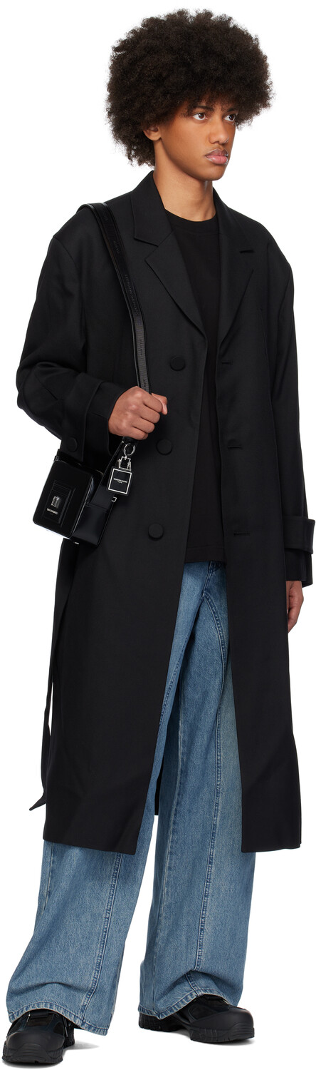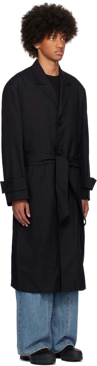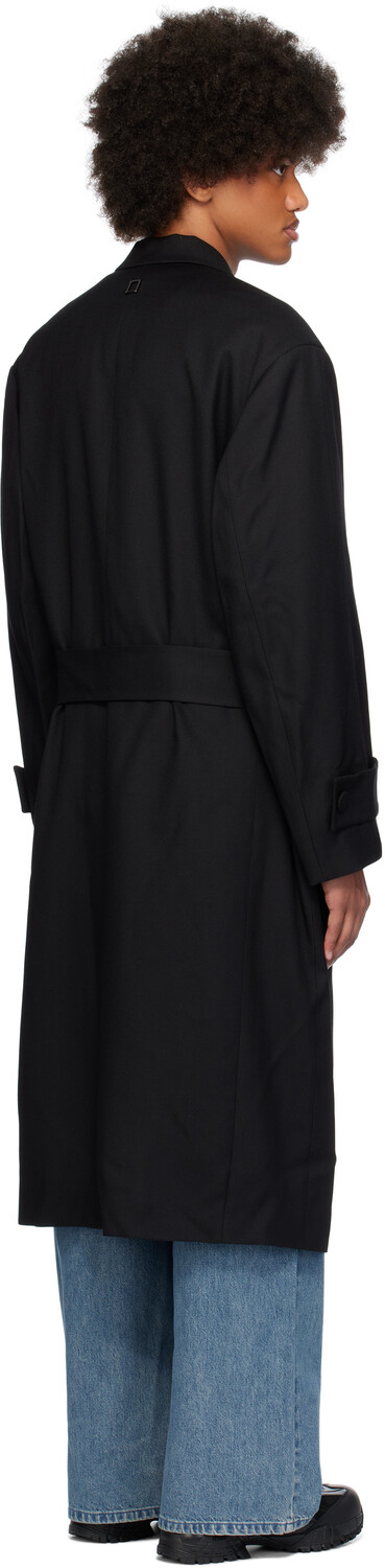 Черное однобортное пальто с поясом. Шерстяное пальто из саржи. · Зазубренный лацкан · Застежка на пуговицы · Прорезные карманы · Шлевки и съемный пояс на завязке · Мягкие плечи · Пуговица на манжетах · Фурнитура с логотипом на воротнике сзади · Центральный разрез на подоле сзади · Прорезные карманы внутри · Полностью атласная подкладка Цвет поставщика: черный Основная часть: 100% шерсть. Подкладка: 50% полиэстер, 50% вискоза. Сделано в Южной Корее.