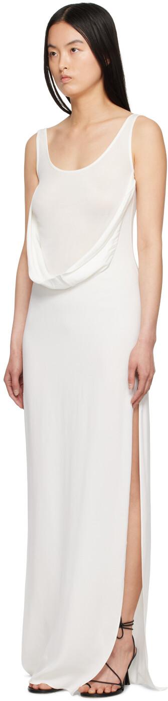 Белое платье-макси Fusion Arced. Платье из эластичного вискозного крепа с резинкой. · Панельная конструкция. · Овальный вырез. · Драпировка спереди. · Разрез в боковом шве. · Без подкладки. Цвет поставщика: белый. Корпус 1: 97% вискозы, 3% эластана. Корпус 2: 95% вискозы, 5% эластана. Сделано во Вьетнаме.