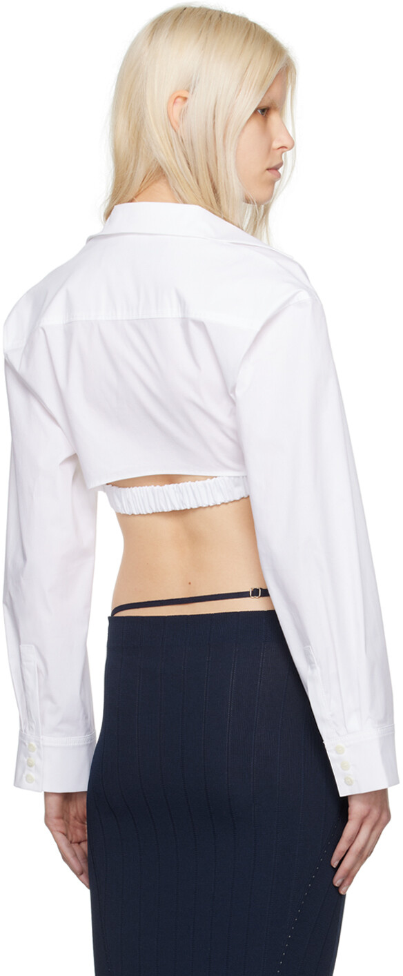 Белая рубашка Le Chouchou 'La Chemise Bahia Courte'. Рубашка из эластичного хлопкового поплина. · Отложной воротник · Застежка на пуговицы · Перекрученная отделка на укороченном подоле · Манжеты-бочонки с тремя пуговицами · Вырез и эластичная отделка на подоле сзади Часть коллекции Le Chouchou. Цвет поставщика: белый 96% хлопок, 4% эластан. Сделано в Болгарии.