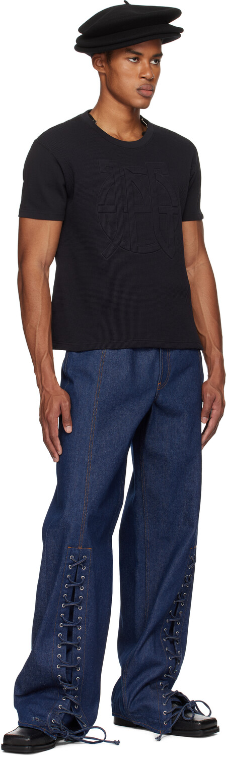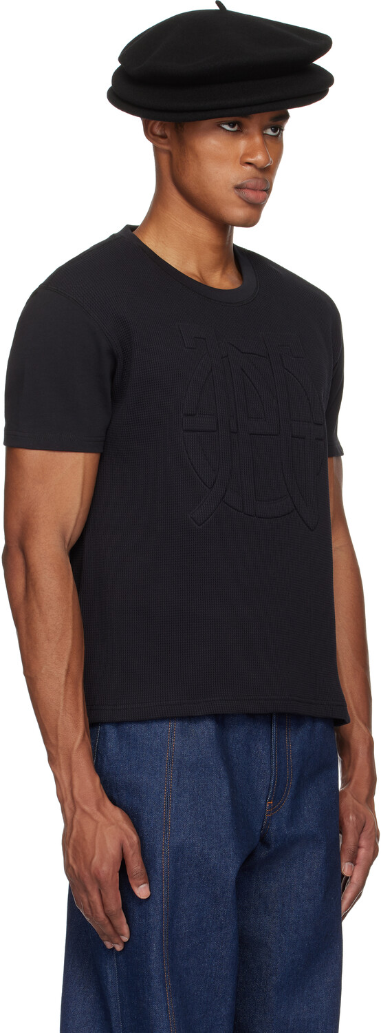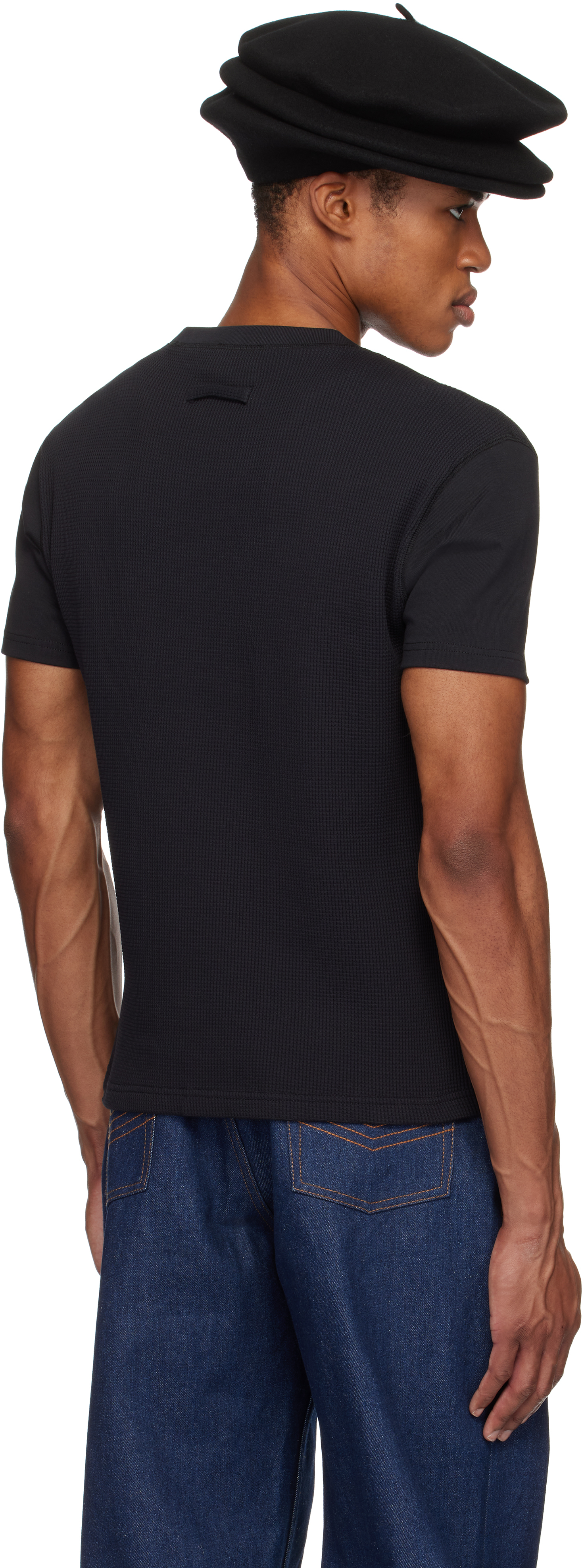 Черная футболка «The Oversized JPG». Футболка oversize из хлопка и хлопкового джерси с вафельной вязкой. · Панельная конструкция · Круглый вырез горловины из трикотажной резинки · Тисненый логотип спереди · Петля для застежки на воротнике сзадиЦвет поставщика: черный, 100% хлопок. Сделано в Португалии.
