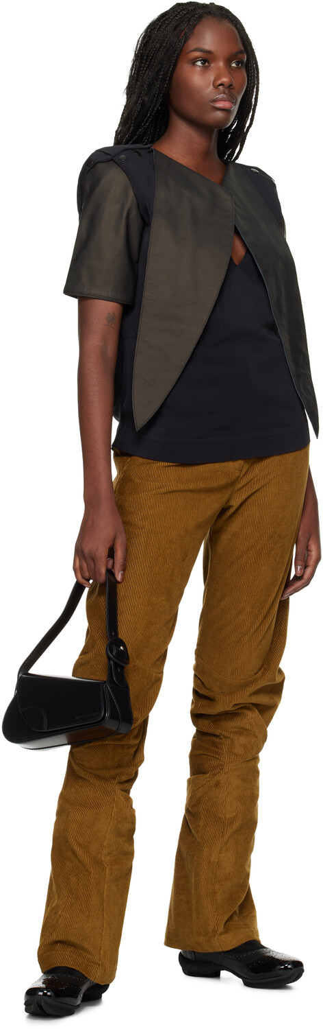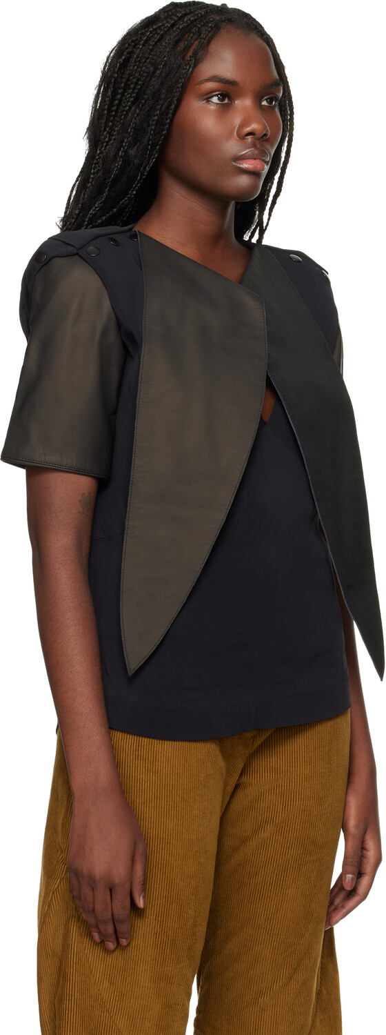 Черная футболка Kiko Kostadinov Edition Eero. Футболка из вискозного джерси и зернистой кожи.· Панельная и многослойная конструкция· V-образный вырез· Застежки на кнопках на плечах· Вырез и драпировка сзадиЧасть сотрудничества ECCO.Kollektive x Kiko Kostadinov.Цвет поставщика: черный. Корпус 1: 100% вискоза. Корпус 2: 100% кожа. Подкладка: 100% хлопок. Сделано в Индии.