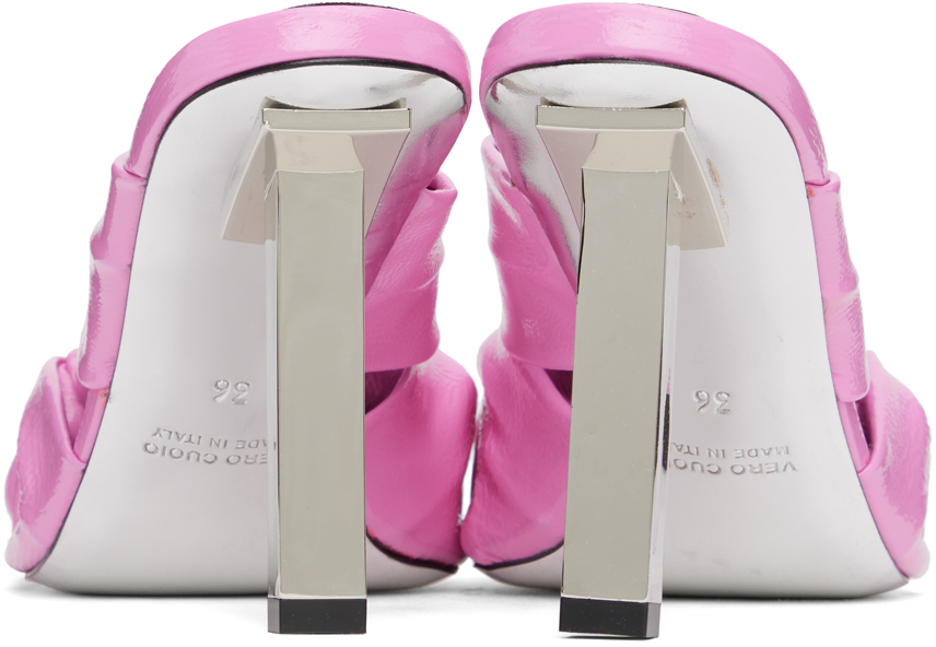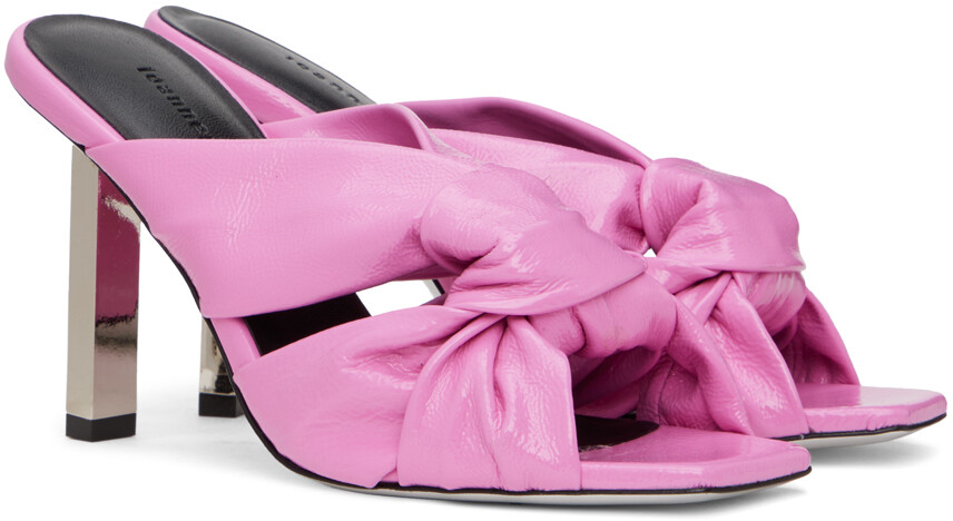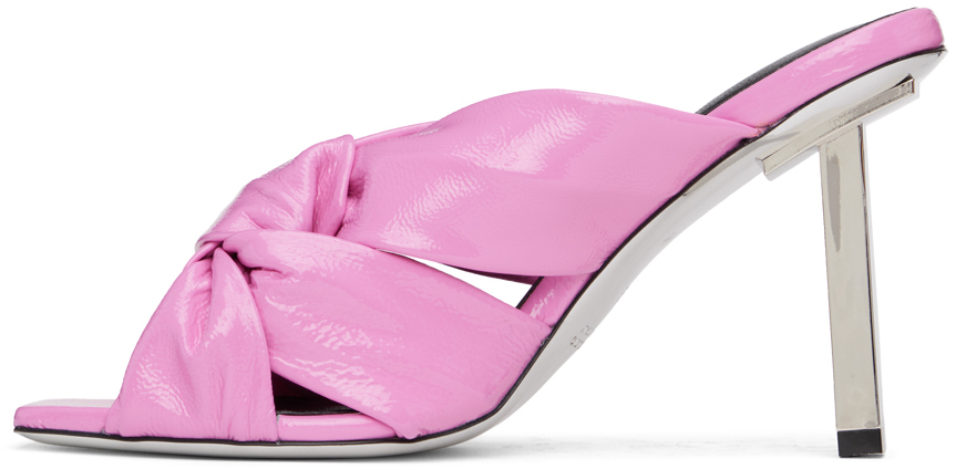 Розовые босоножки в стиле рококо. Босоножки на каблуке из лакированной кожи розового цвета. · Открытый квадратный носок · Узелковый акцент на союзке · Тисненый логотип на мягкой кожаной стельке · Обтянутый каблук-шпилька с резиновым напылением · Кожаная подошва · Каблук: H3 в цвете поставщика: розовая кожа. Сделано в Италии.