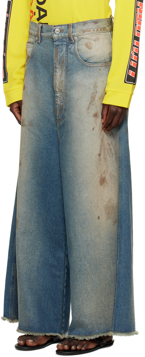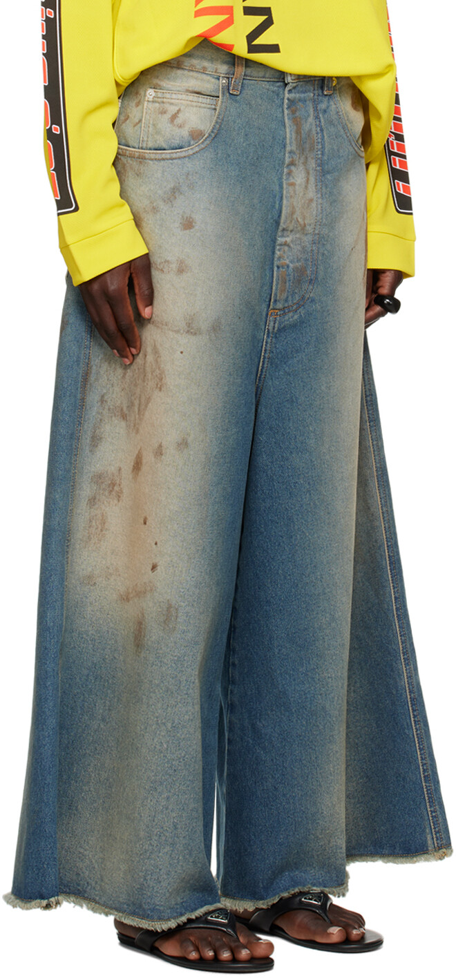 Синие широкие укороченные джинсы. Джинсы из неэластичного денима с широкими штанинами. Выцветание и пятна по всей длине.· Шлевки для ремня· Модель с пятью карманами· Застежка-молния· Потертый край на укороченных штанинах· Нашивка с логотипом сзади на поясе· Серебристая фурнитура с гравировкой логотипа Цвет поставщика: окрашенный в синий цвет 100% хлопок. Сделано в Италии.