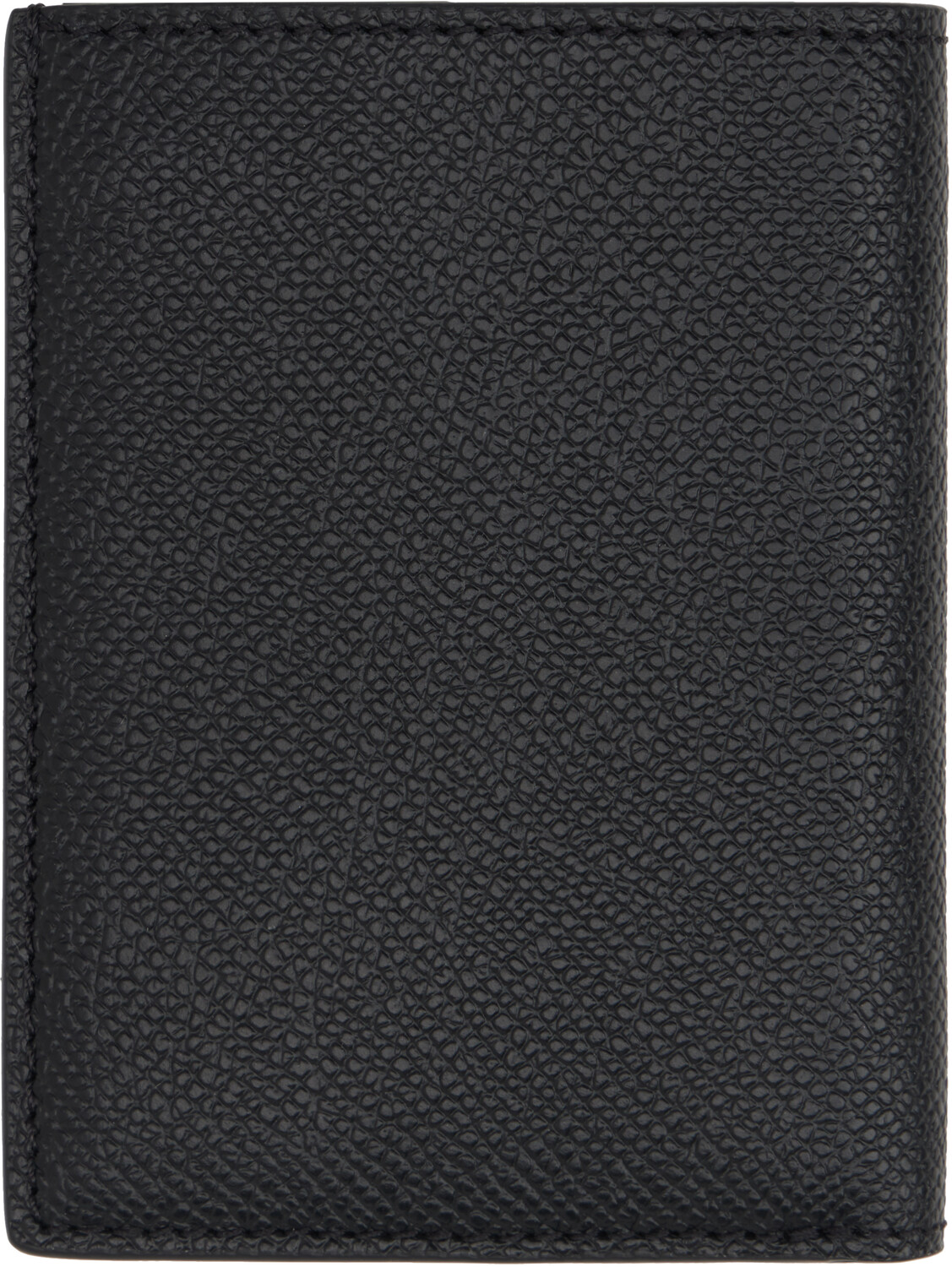 Складной держатель карт из черной мелкозернистой кожи. Складной держатель карт из телячьей кожи с зернистой текстурой черного цвета.· Врезной логотип на лицевой стороне.· Шесть отделений для карт.· Центральное отделение для купюр.· Подкладка из зернистой овчины.· Серебристая фурнитура.· В4" x Ш3". Цвет поставщика: черная телячья кожа. Сделано в Италии.