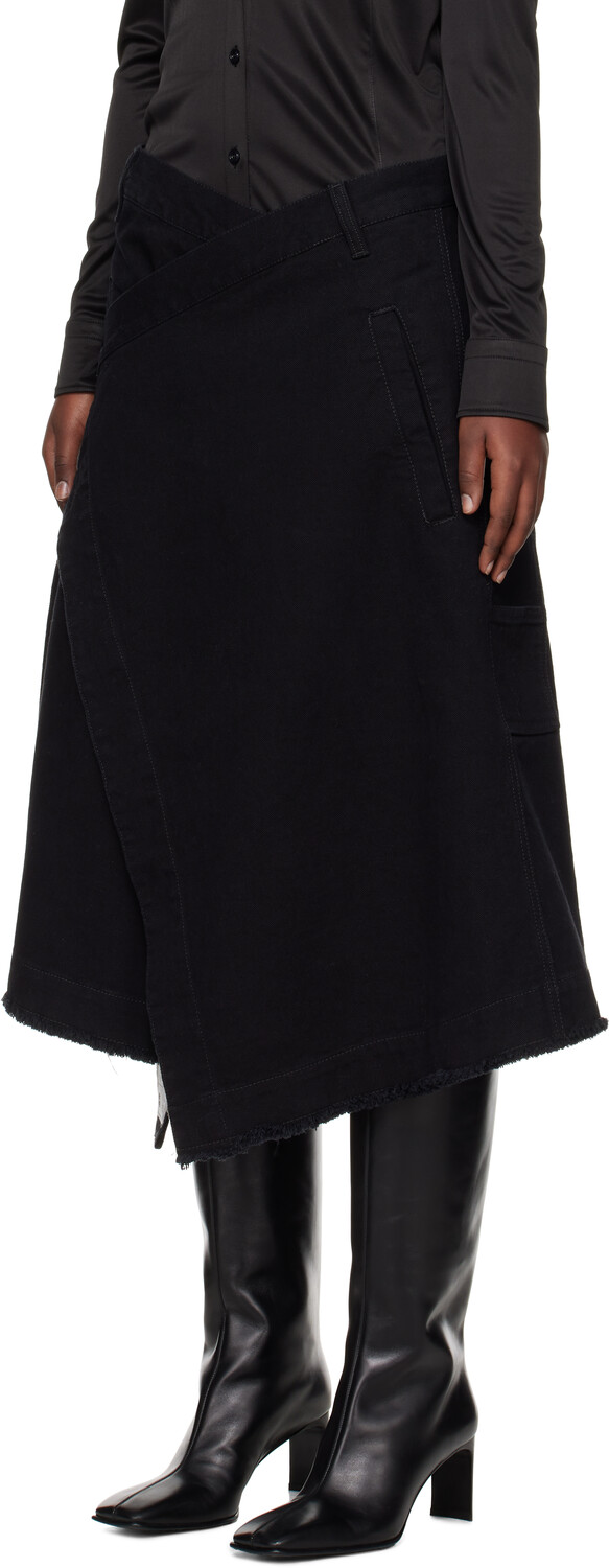 Черная джинсовая юбка-фартук миди. Свободная джинсовая юбка миди из неэластичного денима. · Конструкция с запахом · Шлевки для ремня · Четыре кармана · Регулируемая застежка на пуговицы · Завязывается на шнурок · Необработанный край по подолу · Накладные карманы по боковому шву · Нашивка с логотипом сзади на поясе · Выгравированный логотип серебристой фурнитуры Цвет поставщика: черный, промытый 100% хлопок. Сделано в Италии.