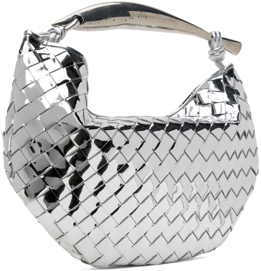 Сумка Silver Sardine. Сумка из ламинированной лакированной кожи ягненка с ручкой сверху, выполненной методом плетения Intrecciato, в серебристом оттенке. Узловые акценты на скульптурной металлической ручке для переноски. Магнитная застежка. Без подкладки. В9,5" x Ш14" x Г1". Цвет поставщика: серебристый винтажный. Корпус: 100% кожа ягненка. Отделка: 100% латунь. Сделано в Италии.
