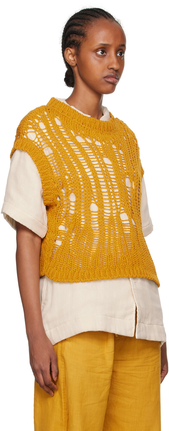 Желтый жилет Laddering. Жилет открытой вязки из переработанного кашемира и смеси шерсти. Лестницы по всей длине. Круглый вырез, подол и проймы связаны в рубчик. Цвет поставщика: шафрановый. 50% переработанного кашемира, 50% шерсти. Сделано в США.