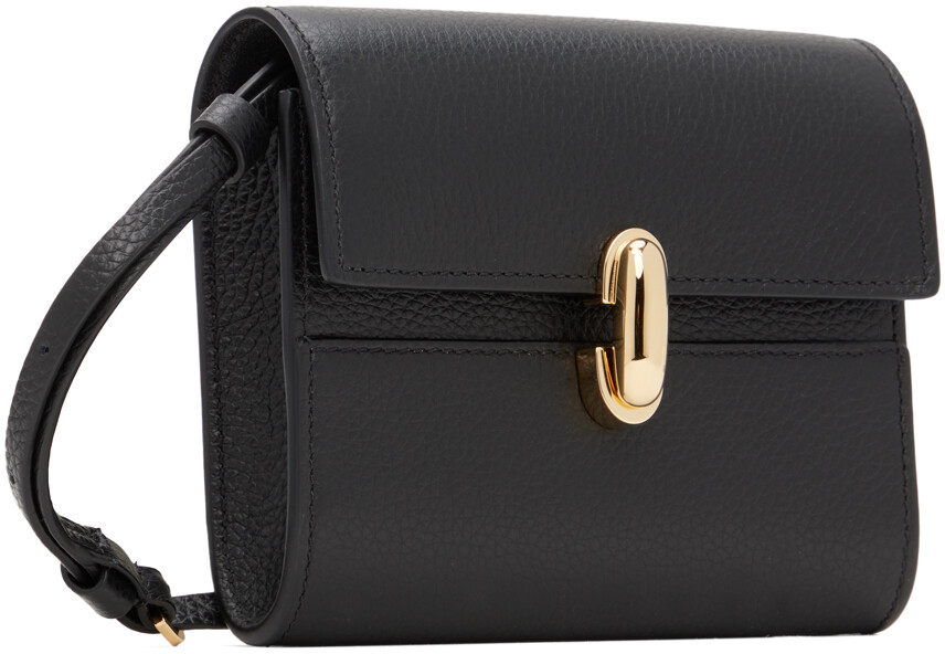 Черная сумка-кошелек Symmetry. Сумка через плечо из зернистой телячьей кожи черного цвета. Регулируемый и съемный ремень через плечо. Клапан на кнопке. Шесть отделений для карт внутри. Подкладка из полированной кожи. Золотистая фурнитура. Высота 4,5" x Ширина 4,75" x Длина 1,5". Цвет поставщика: черная телячья кожа. Сделано в Италии.