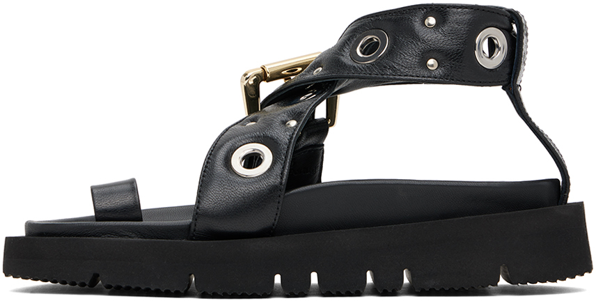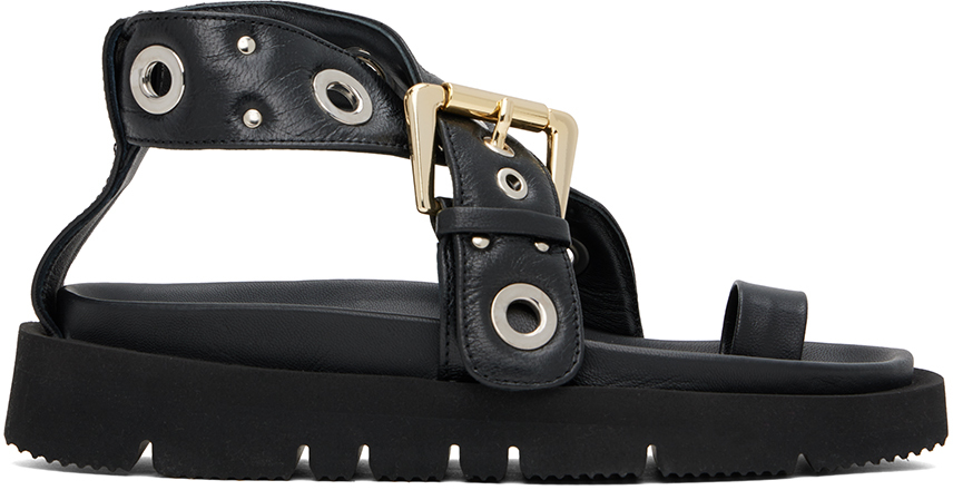 Черные сандалии Natacha Ramsay-Levi Edition Concarneau. Босоножки из полированной козьей кожи черного цвета. · Металлические люверсы и заклепки по всей длине. · Открытый носок. · Фиксированный ремешок на носке. · Перекрещивающиеся ремешки с пряжками на союзке. · Тисненый логотип на пятке. · Логотип на формованной кожаной стельке. · Прорезиненная подошва с протектором. · Платформа: H1.25". Часть сотрудничества APC x Natacha Ramsay-Levi. Цвет поставщика: черный. Верх: козья кожа. Подошва: резина. Сделано в Португалии.