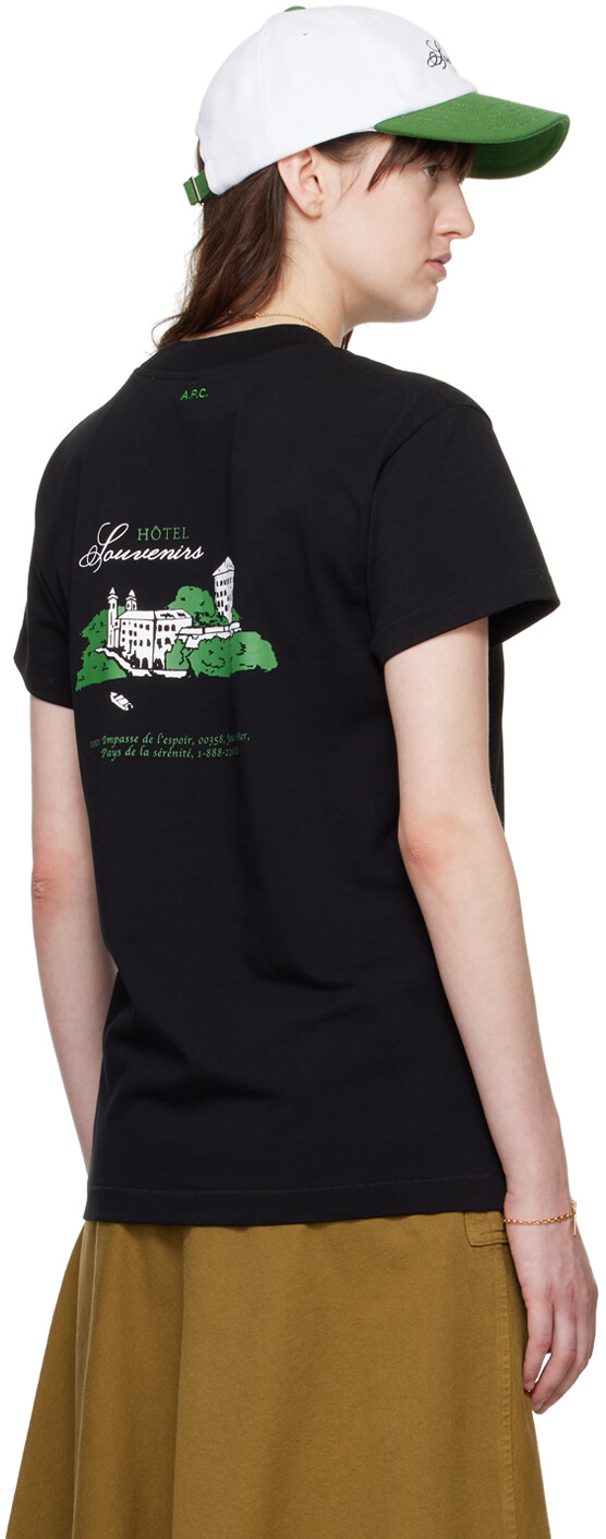 Черная футболка JJJJound Edition 'Hôtel Souvenirs'. Футболка из плотного органического хлопкового джерси плотностью 220 г. · Круглый вырез горловины из трикотажа в рубчик · Напечатанный текст на груди · Логотип-флажок на боковом шве · Напечатанный текст и графика на спине. Часть сотрудничества APC x JJJJound. Цвет поставщика: черный 100% хлопок. Сделано в Португалии.