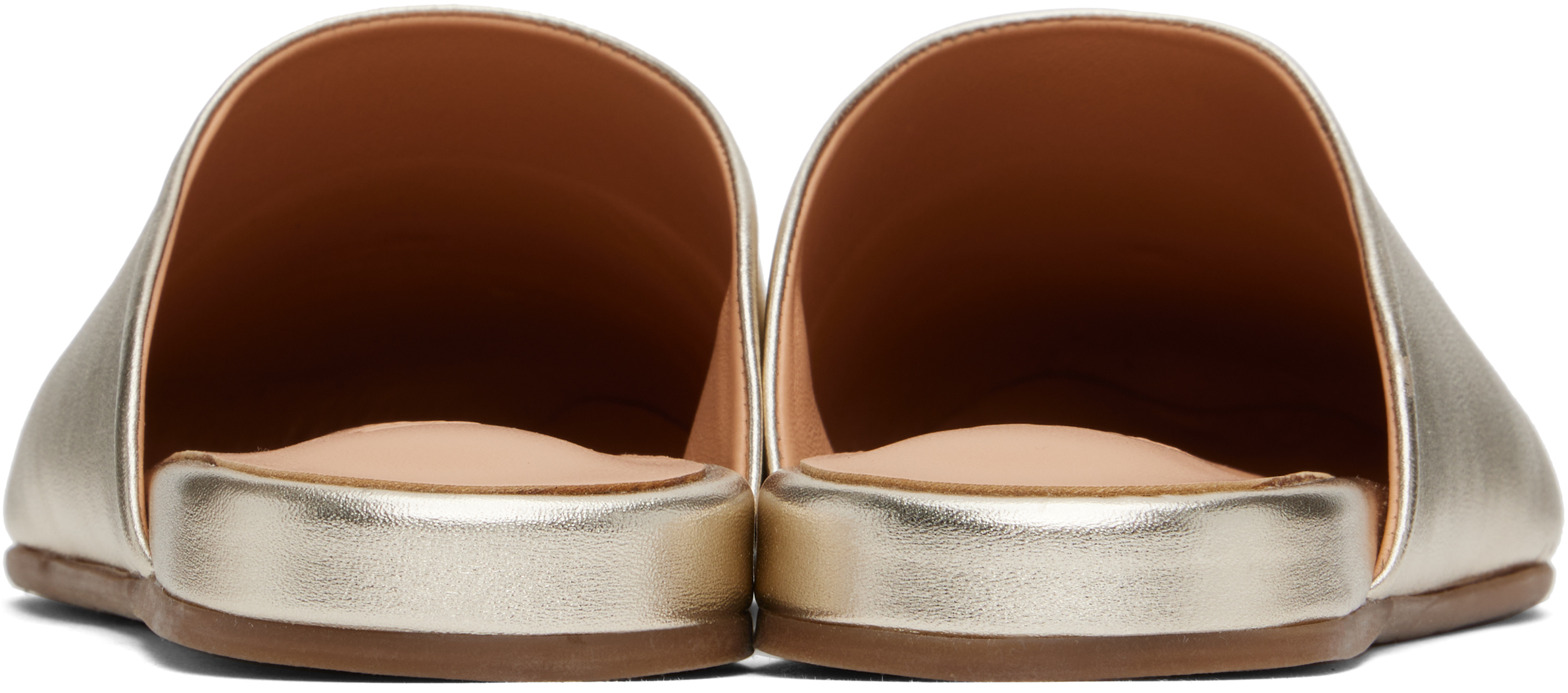 Золотые мюли «The Slipper». Мюли из полированной кожи наппа, изготовленные вручную, в металлическом золотом тоне. · Мягкая кожаная стелька с тиснением логотипа. · Подкладка из зернистой телячьей кожи. · Резиновая подошва с тиснением логотипа. Цвет поставщика: платина. Верх: кожа. Подошва: резина. Сделано в Греции.