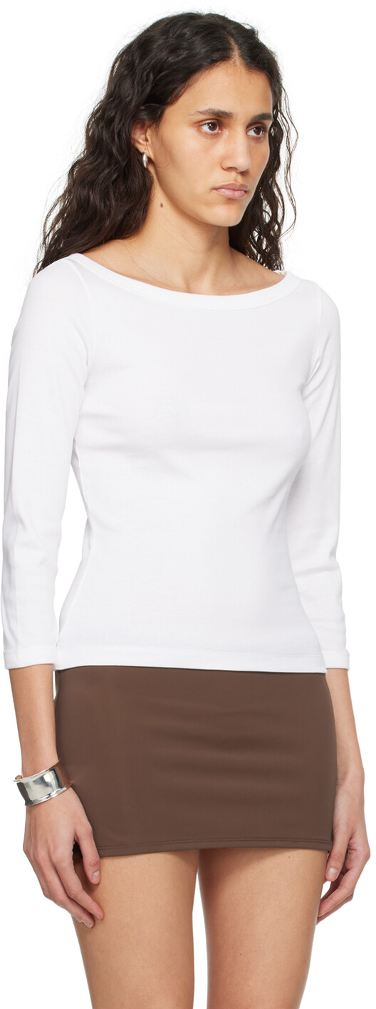 Белая футболка Steffi с длинным рукавом. Футболка из органического хлопкового джерси. · Трикотажный вырез лодочкой. · Рукава три четверти. · Центральный шов сзади. Цвет поставщика: белый. 100% органический хлопок. Сделано в Португалии.