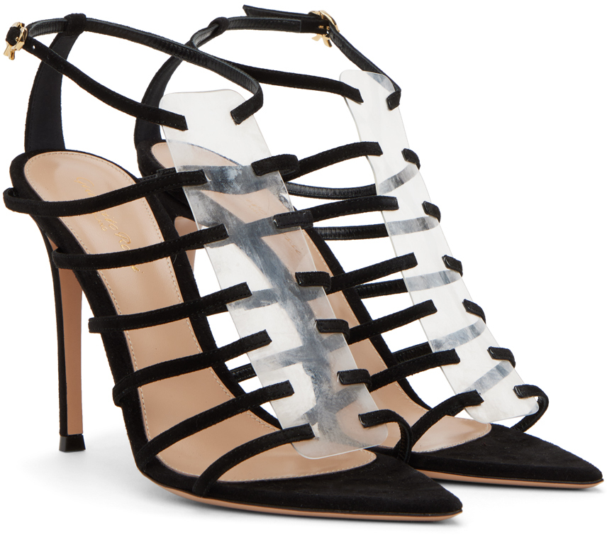 Черные замшевые босоножки на каблуке. Замшевые босоножки на каблуке черного цвета.· Открытый заостренный носок· Прозрачная панель из ПВХ на союзке· Ремешок на щиколотке с пряжкой· Резиновое литье на каблуке-шпильке· Кожаная подошва· Каблук: H4 inЦвет поставщика: черный/прозрачная кожа. Сделано в Италии.