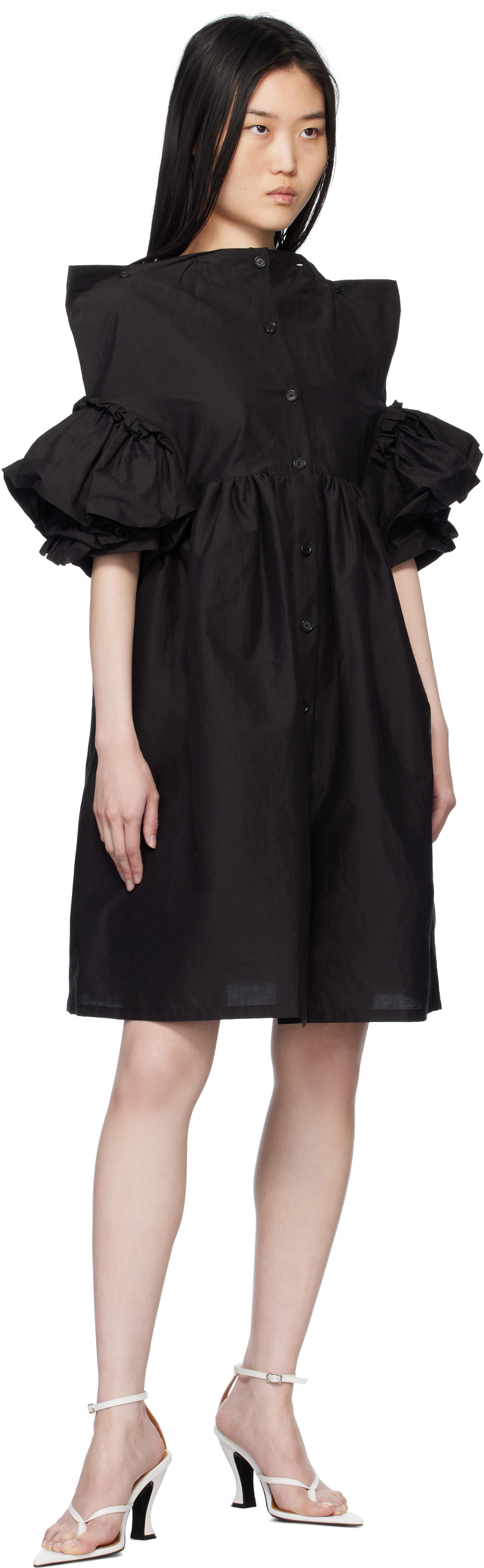 Мини-платье Black Square. Мини-платье из смеси льна и нейлона полотняного переплетения. Сборки по всему изделию.· Застежка на пуговицы на удлиненном вырезе-лодочке.· Застежка на пуговицы.· Спущенные плечи.· Оборки на рукавах-фонариках.· Застежка на пуговицы на воротнике сзади.· Вырез на спине.· Центральный разрез на подоле сзади.· Частичная подкладка из купро-сатина. Цвет поставщика: черный. Состав: 36% лен, 35% нейлон, 29% хлопок. Подкладка: 100% купро. Сделано в Южной Корее.