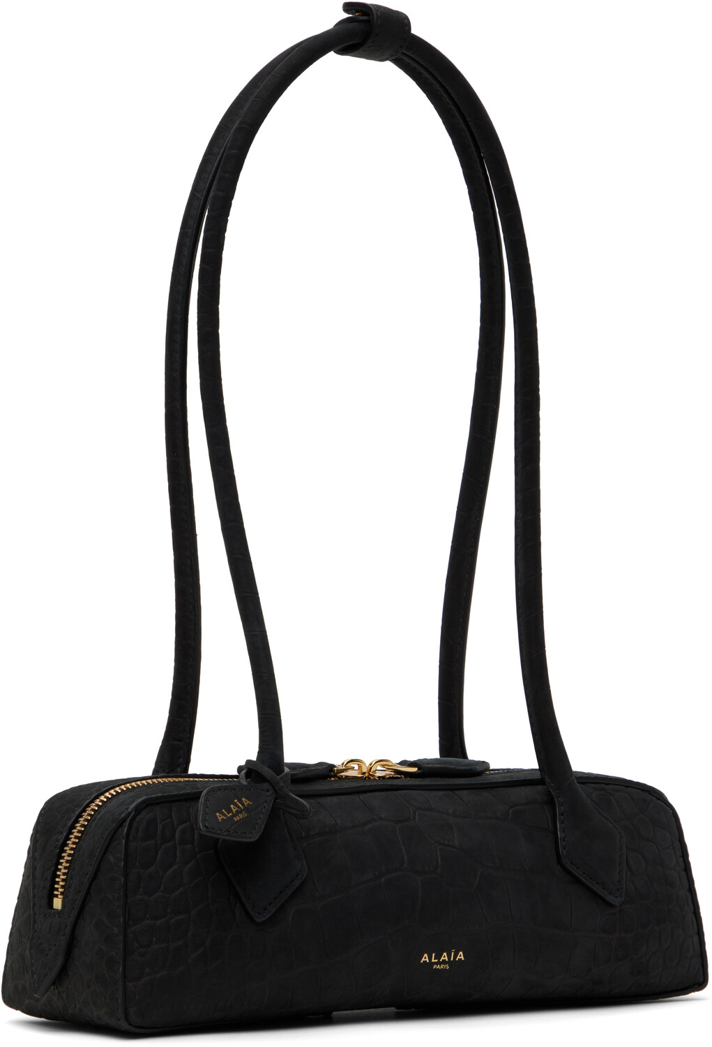 Черная маленькая сумка «Le Teckel». Сумка через плечо из нубука с тиснением под крокодила черного цвета.· Застежка-кнопка на подвернутых плечевых ремнях.· Съемная бирка с логотипом на плечевом ремне.· Логотип на лицевой стороне.· Двусторонняя застежка-молния.· Отделение для карточек внутри.· Замшевая подкладка.· В3,5" x Ш10,5" x Г3,5". Цвет поставщика: кожа Noir. Сделано в Италии.