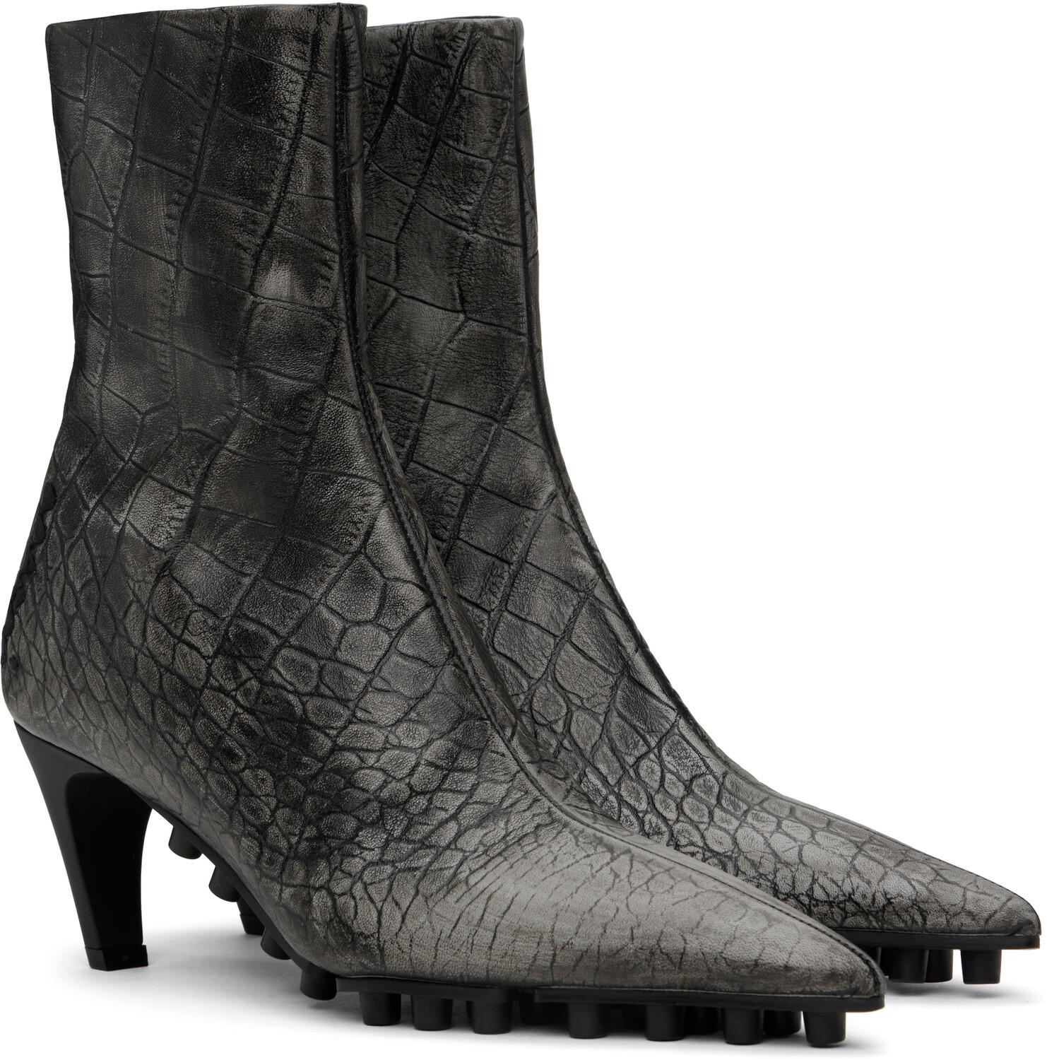Ботильоны Grey Spike. Ботинки из кожи с тиснением под крокодила серого цвета. · Потертости по всей поверхности. · Острый носок. · Вышитый логотип на внешней стороне. · Застежка-молния на внутренней стороне. · Подкладка из полированной кожи. · Каблук-шпилька с резиновым напылением. · Резиновая подошва с рифлением. · Каблук: H2.5". Цвет поставщика: черный. Верх: кожа. Подошва: резина. Сделано в Италии.