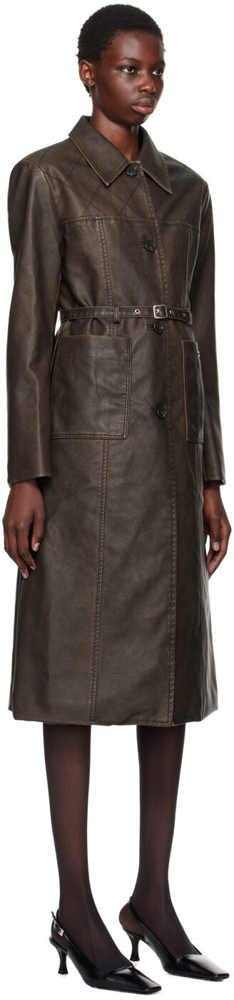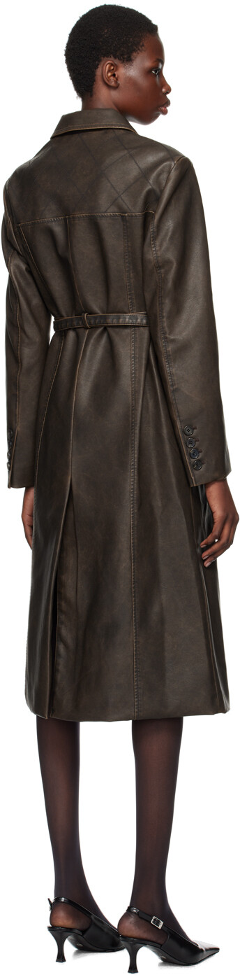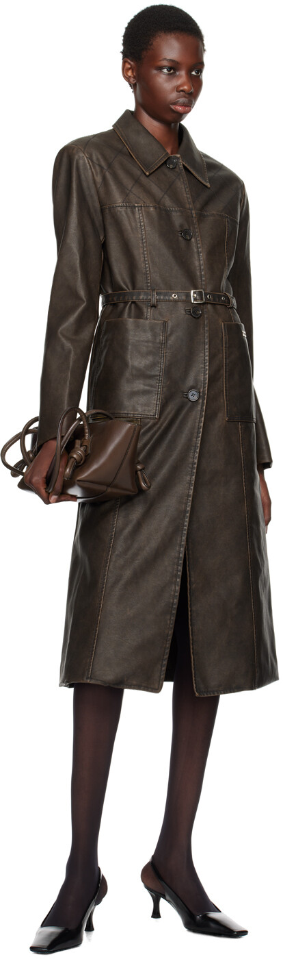 Коричневое прошитое пальто из искусственной кожи. Пальто из зернистой искусственной кожи. Выцветание по всей длине. · Отложной воротник · Застежка на пуговицы · Съемный ремень с пряжкой · Пластинка с логотипом и накладные карманы спереди · Прострочка на подбитых плечах · Манжеты на четырех пуговицах · Центральный разрез сзади на подоле · Прорезной карман внутри · Полная парусиновая подкладка Цвет поставщика: темно-коричневый 65% полиуретана, 35% вискозы. Сделано в Южной Корее.